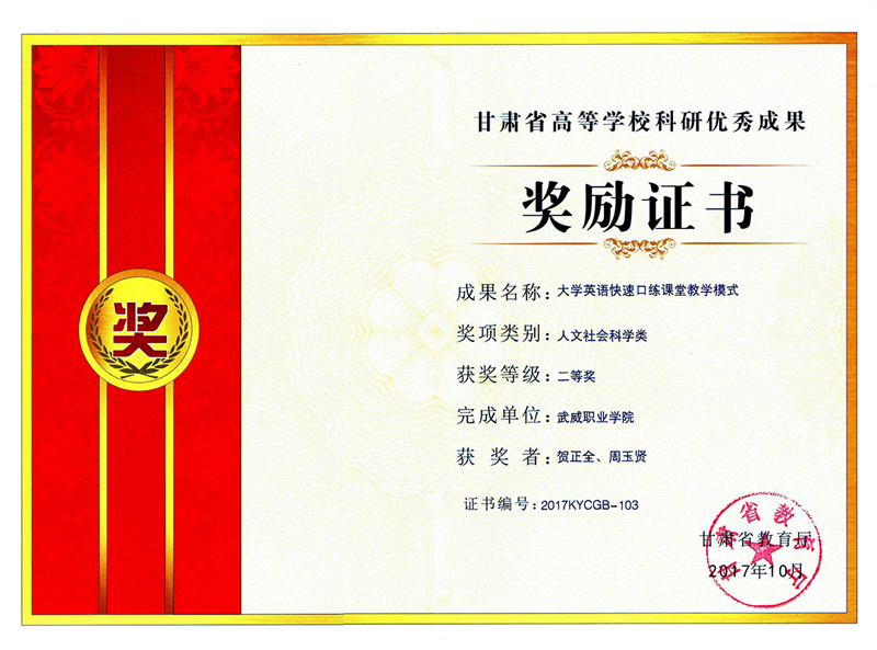 近日從學(xué)院科研處傳來喜訊,我系教師賀正全申報的《大學(xué)英語快速口練課堂教學(xué)模式》榮獲甘肅省教育廳頒發(fā)的2017年甘肅省高等學(xué)??蒲袃?yōu)秀成果二等獎。這是我院自建院以來獲得的最高級別的高??蒲袃?yōu)秀成果獎。本次獲得二等獎的科研成果共有154項,其中高職高專報送的科研成果只有9項獲得二等獎。