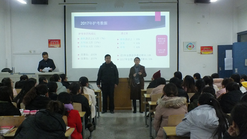 此次講座由去西安參加2018年護(hù)考師資培訓(xùn)的牛子勁老師主講。牛老師分別從2017年護(hù)考成績數(shù)據(jù)分析、護(hù)考試題新特點(diǎn),以及2018年護(hù)考命題的趨勢進(jìn)行了詳細(xì)分析與說明,并且提出了應(yīng)對策略。他希望2015級護(hù)考生準(zhǔn)確把握護(hù)考形勢,確定應(yīng)考學(xué)習(xí)計(jì)劃,結(jié)合護(hù)考要求加強(qiáng)專業(yè)課學(xué)習(xí),在明年的護(hù)考中取得好成績。