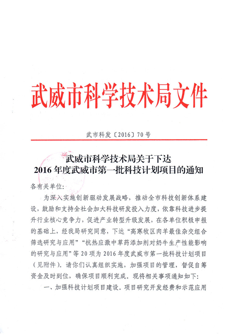 科研項目---2016年度武威市第一批科技計劃項目