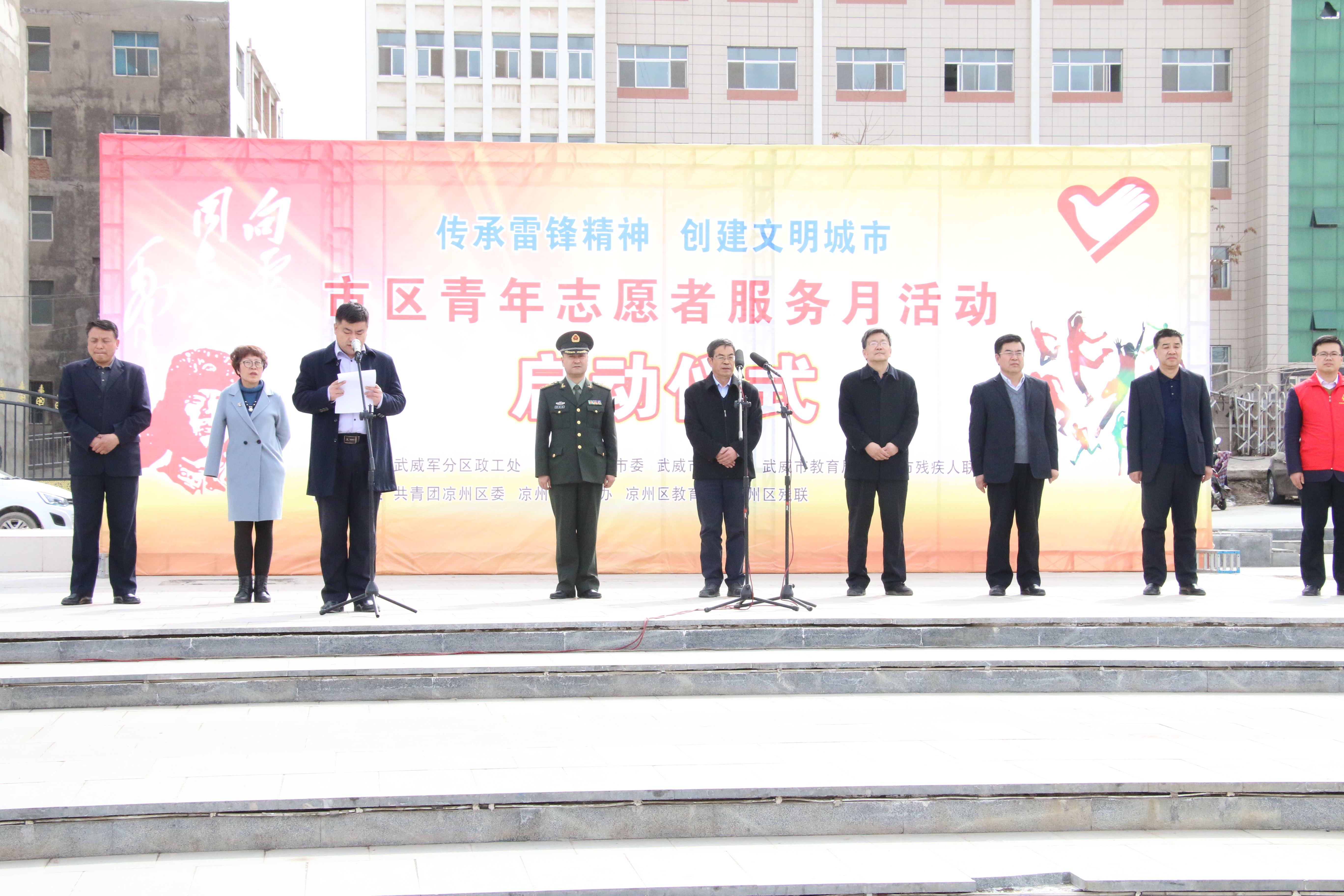 今年是毛澤東等老一輩革命家為雷鋒同志題詞55周年,3月5日是中國(guó)青年志愿者服務(wù)日。 3月5日下午,學(xué)院50名志愿者在武威市文化廣場(chǎng)參加了全市志愿者服務(wù)月活動(dòng)啟動(dòng)儀式,活動(dòng)現(xiàn)場(chǎng)氣氛熱烈,市領(lǐng)導(dǎo)為我院志愿服務(wù)隊(duì)進(jìn)行了授旗,青年志愿者代表宣讀了倡議書(shū),全體志愿者重溫了青年志愿者誓詞。