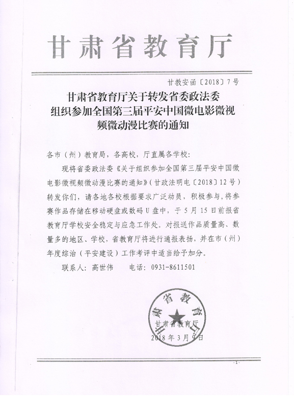 現(xiàn)將甘肅省教育廳關(guān)于轉(zhuǎn)發(fā)《省委政法委<關(guān)于組織參加全國(guó)第三屆平安中國(guó)微電影微視頻微動(dòng)漫比賽的通知>》(甘政法明電〔2018〕12號(hào))轉(zhuǎn)發(fā)你們,請(qǐng)各部門(mén)、單位根據(jù)要求廣泛動(dòng)員,積極參與。將參賽作品存儲(chǔ)在移動(dòng)硬盤(pán)或數(shù)碼U盤(pán)中,于5月10日前報(bào)宣傳統(tǒng)戰(zhàn)部辦公室,宣傳統(tǒng)戰(zhàn)部對(duì)報(bào)送作品匯總后統(tǒng)一報(bào)送省教育廳。