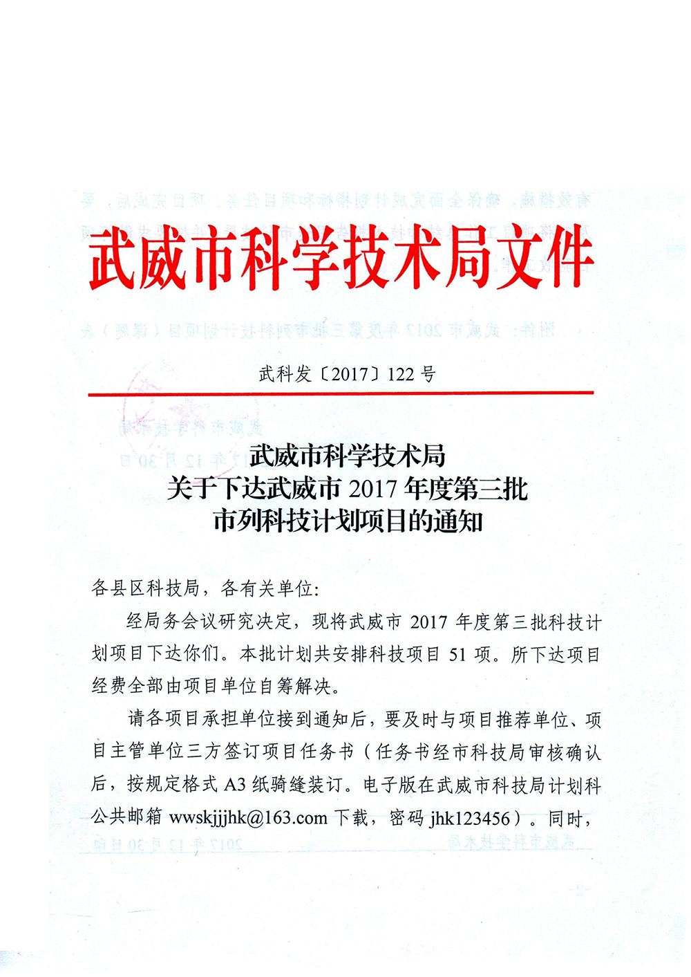 轉(zhuǎn)發(fā)武威市科學(xué)技術(shù)局關(guān)于下達武威市2017年度第三批市列科技計劃項目的通知