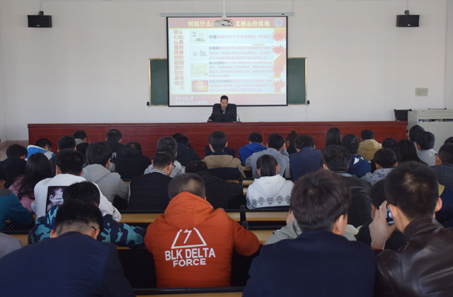 翟存祥從社會主義核心價值觀的時代背景、社會主義核心價值觀的頂層設(shè)計、核心價值觀與核心價值體系的關(guān)系、社會主義核心價值觀的系統(tǒng)培育、社會主義核心價值觀的全面踐行等五個方面,分析了中國共產(chǎn)黨價值取向的發(fā)展歷程、培育和踐行社會主義核心價值觀的重要性和迫切性,培育和踐行社會主義核心價值觀對實現(xiàn)中國夢的重要現(xiàn)實意義和深遠(yuǎn)歷史意義,以及培育和踐行社會主義核心價值觀的措施等問題,并對為什么要培育和踐行、怎么培育和踐行作了系統(tǒng)和精彩的解讀。翟存祥指出,十八大報告將社會主義核心價值觀凝練為24個字:“富強(qiáng)、民主、文明、和諧;自由、平等、公正、法治;愛國、敬業(yè)、誠信、友善”,從國家、社會、個人三個層面,簡單扼要、簡約樸實、簡潔通俗地提出了社會主義核心價值觀的新表達(dá),也為當(dāng)今中國社會的核心價值觀構(gòu)建提出了新要求。社會主義核心價值觀既有理論的延續(xù)性,又有現(xiàn)實的針對性;既有目標(biāo)追求,又有價值導(dǎo)向,還有行為準(zhǔn)則,是人心所愿、眾望所歸。翟存祥結(jié)合學(xué)院發(fā)展實際,要求學(xué)生黨員及班團(tuán)干部從現(xiàn)在做起,從自己做起,努力向上,踐行社會主義核心價值觀,追求有信念,有夢想,有奮斗,有奉獻(xiàn)的人生,讓自己的人生更有意義。