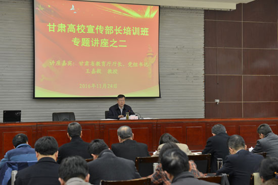 王嘉毅在專題講座中介紹了甘肅高等教育現(xiàn)狀、存在問題和“十三五”發(fā)展目標。他指出,高校宣傳思想工作主要任務要把學習貫徹落實黨的十八大以來的重大部署,特別是六中全會精神和習近平總書記系列重要講話精神作為重要任務來抓;要把貫徹落實中宣部、教育部黨組《關(guān)于加強和改進高校宣傳思想工作隊伍建設的意見》精神和省委辦公廳、省政府辦公廳《關(guān)于進一步加強和改進新形勢下高校宣傳思想工作的實施意見》作為重要任務來抓;要把進一步弘揚社會主義核心價值觀、加強正面宣傳、傳播正能量作為重要任務來抓。通過準確把握新形勢下高校宣傳思想工作的動態(tài),分析研判我省高校宣傳思想工作面臨的問題,切實加強高校意識形態(tài)領(lǐng)域的工作,提升網(wǎng)絡輿情掌控應對能力,積極開展馬克思主義研究,全面繁榮哲學社會科學,提高覺悟,凝聚共識,強化措施,全面推動高校宣傳思想工作質(zhì)量提升和創(chuàng)新發(fā)展。