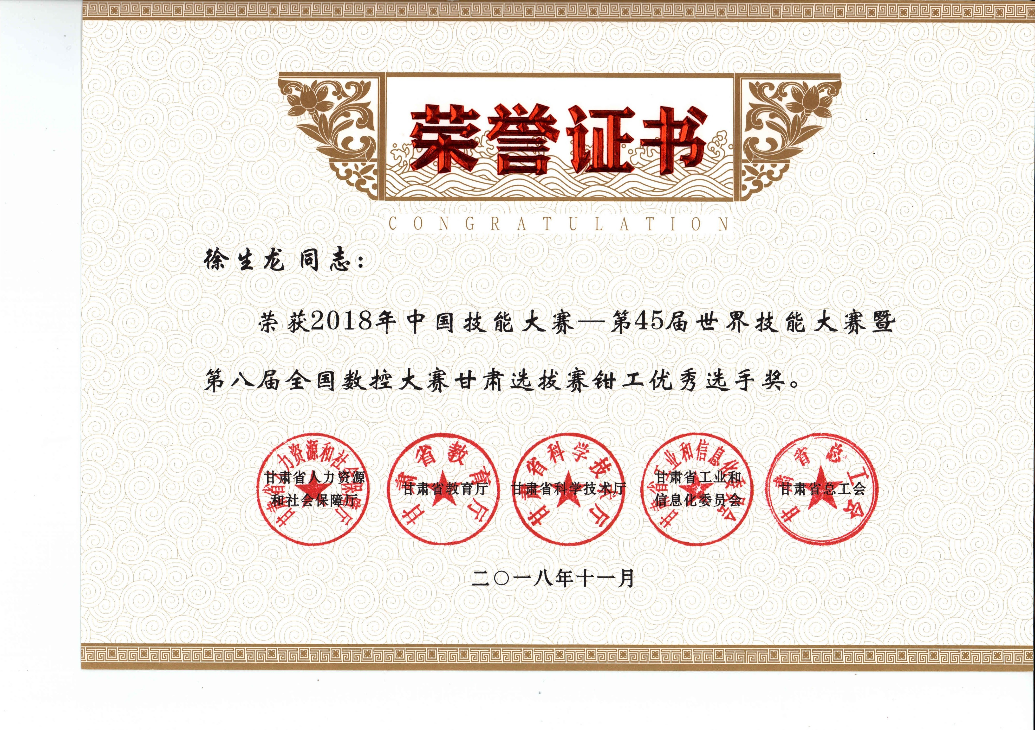 2018年中國技能大賽--第45屆世界技能大賽暨第八屆全國數(shù)控大賽甘肅選拔賽(鉗工項目)獲獎證書