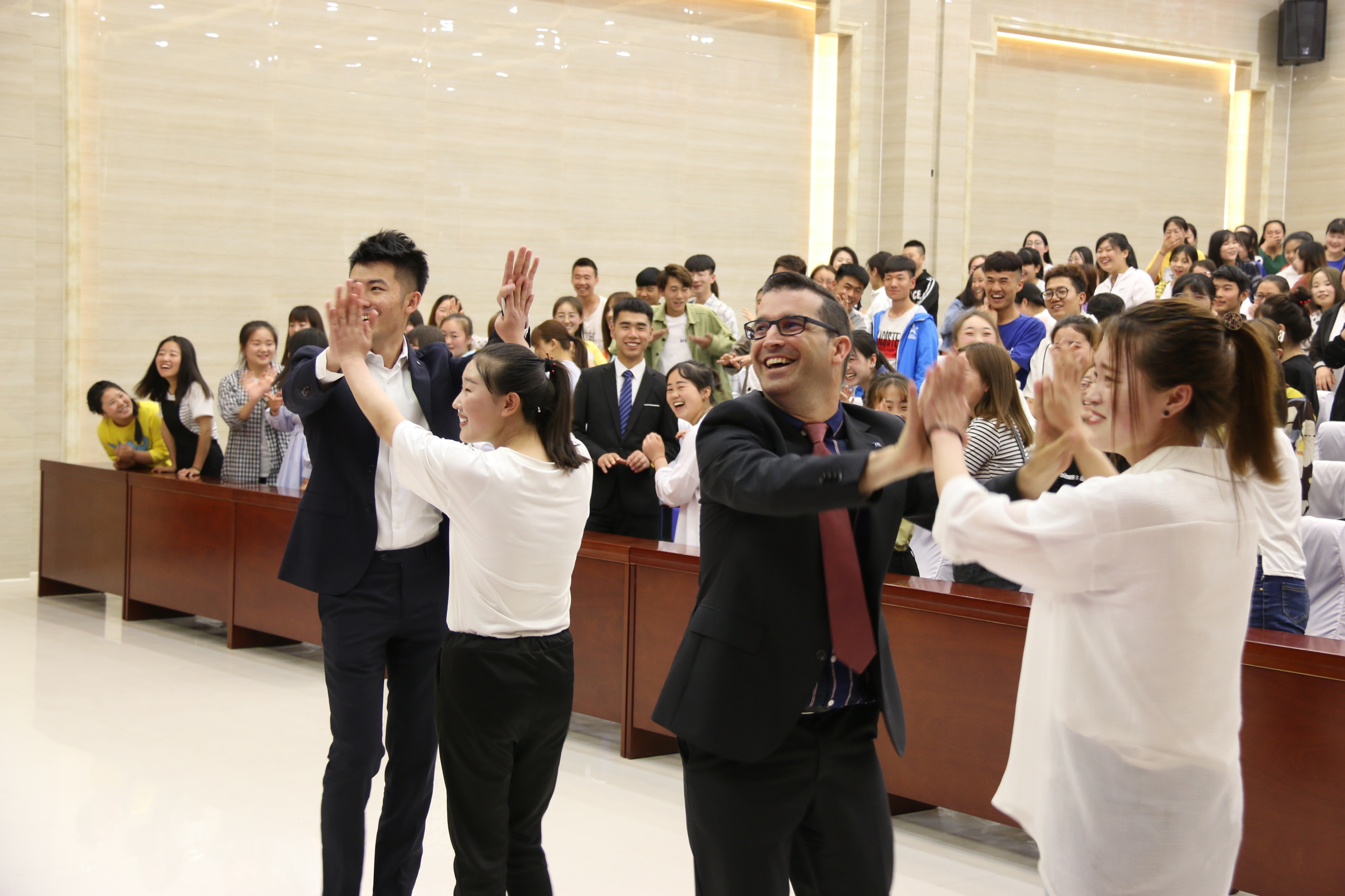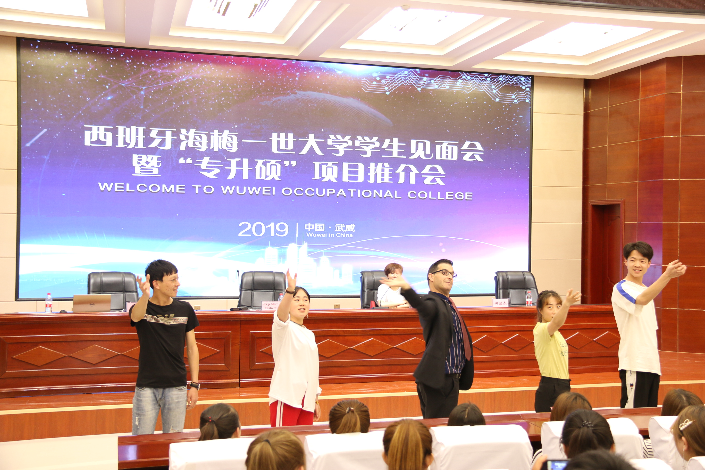 西班牙客人還到菁英廳參加了學(xué)院組織的學(xué)生見面會(huì)。Contreras 先生和同學(xué)們進(jìn)行了語言、歌曲、舞蹈雙向互動(dòng),讓在場(chǎng)所有同學(xué)體驗(yàn)了濃烈的西班牙異域文化,同學(xué)們近距離感受了西班牙客人的熱情奔放、幽默詼諧。Contreras 先生對(duì)學(xué)院學(xué)生的積極主動(dòng)、大膽參與互動(dòng)留下了深刻印象。護(hù)理系、人文藝術(shù)教育系、能源工程系、電子信息工程系等系學(xué)生代表參加活動(dòng)。
