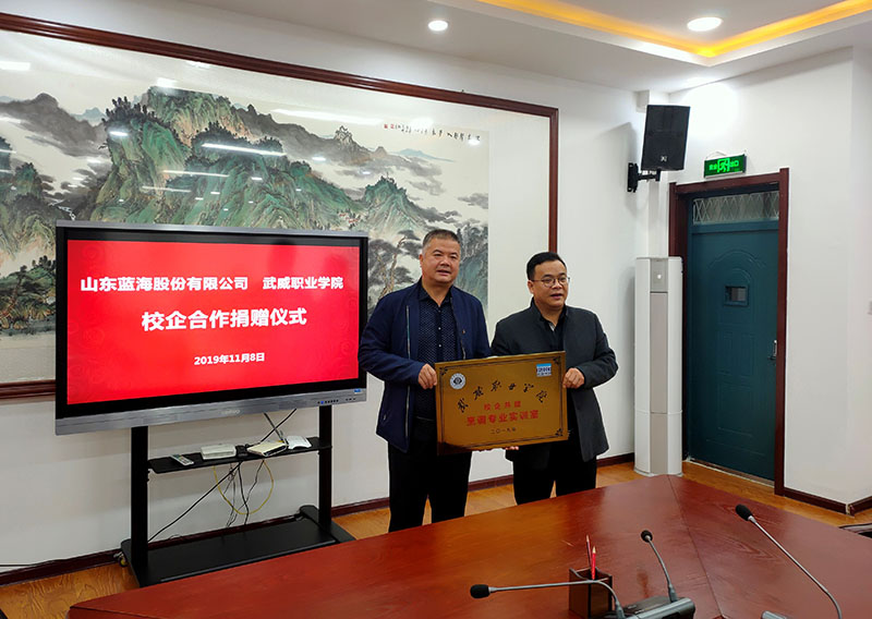 在捐贈儀式上,楊兆永總經(jīng)理介紹了山東藍海股份有限公司做了介紹,雙方在人才需求、專業(yè)課程設(shè)置開發(fā)、雙師型師資培養(yǎng)、教學組織實習質(zhì)量評估、就業(yè)服務等多方面合作近十年,已經(jīng)將校企雙方緊密聯(lián)合在一起,同時希望今后繼續(xù)不斷在師資隊伍培養(yǎng)、人才培養(yǎng)、教育教學繼續(xù)加強合作,實現(xiàn)雙贏,共同發(fā)展。