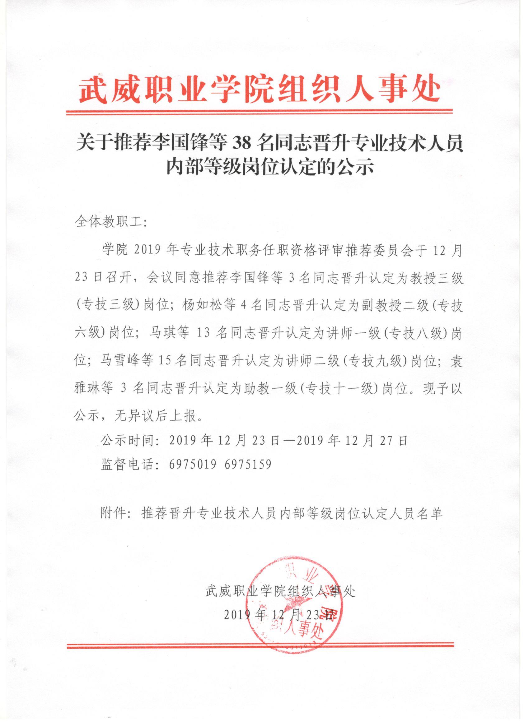 關(guān)于推薦李國鋒等38名同志晉升專業(yè)技術(shù)人員內(nèi)部等級崗位認(rèn)定的公示