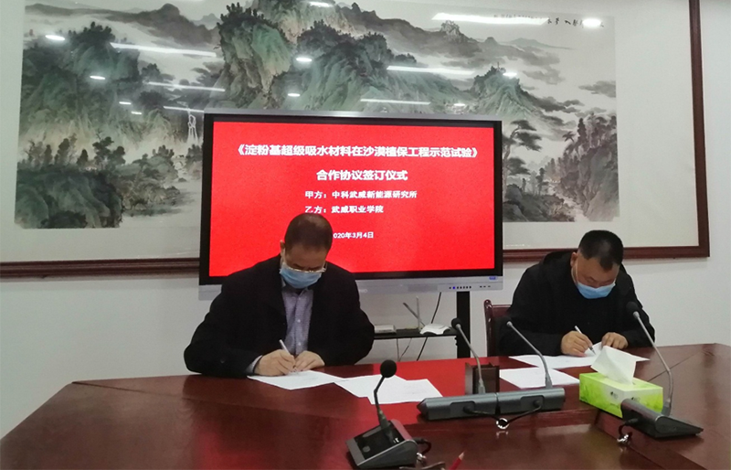 武威職業(yè)學(xué)院與中科武威新能源研究所舉行《淀粉基超級(jí)吸水材料在沙漠植保工程示范試驗(yàn)》科研項(xiàng)目合作協(xié)議簽訂會(huì)議