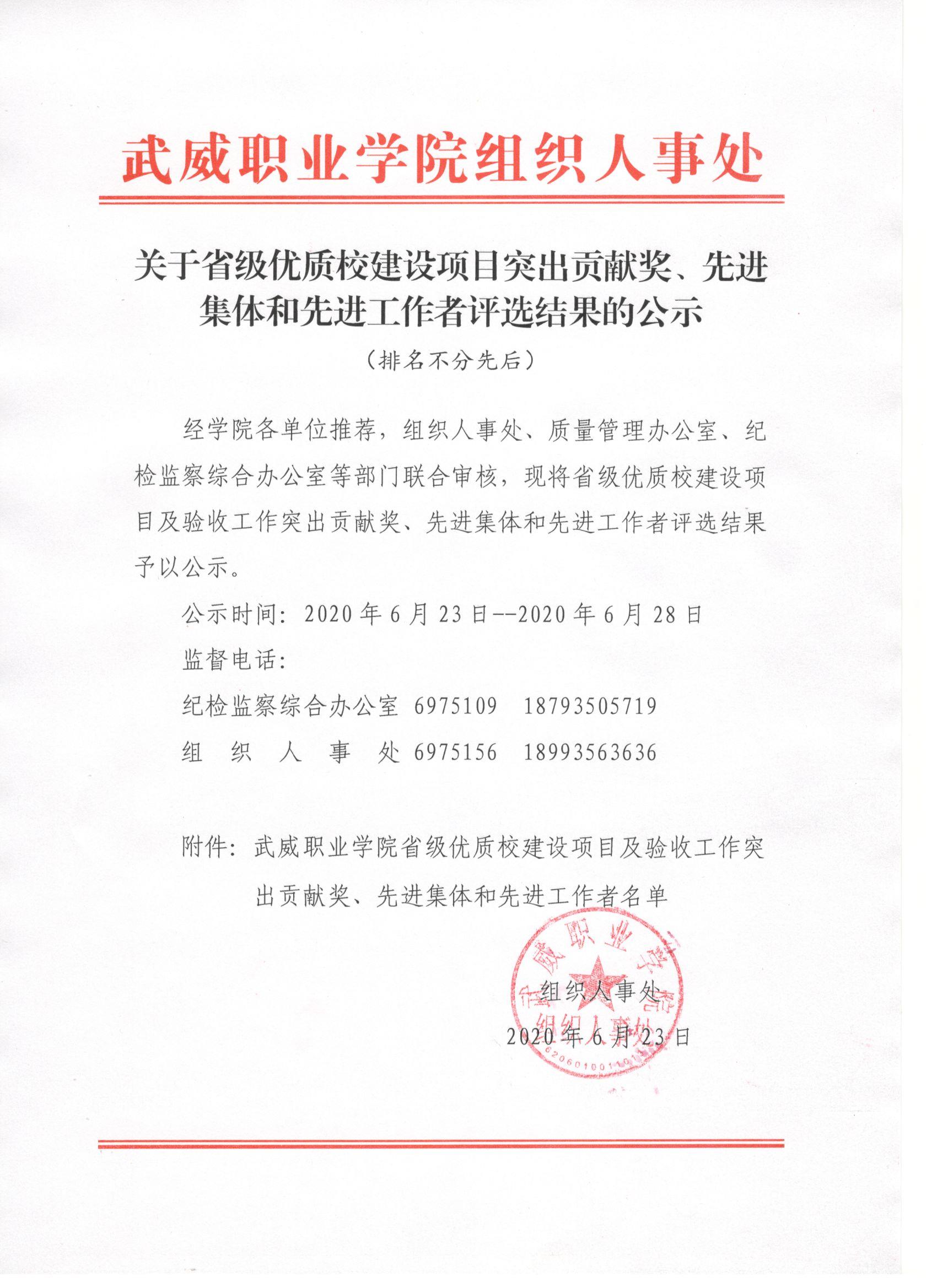 關(guān)于省級優(yōu)質(zhì)校建設(shè)項目突出貢獻獎、先進集體和先進工作者評選結(jié)果的公示