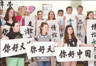 ④ 6月10日,在天津國際漢語學院,參與“妙筆練書法”活動的蘇格蘭師生展示自己的作品。