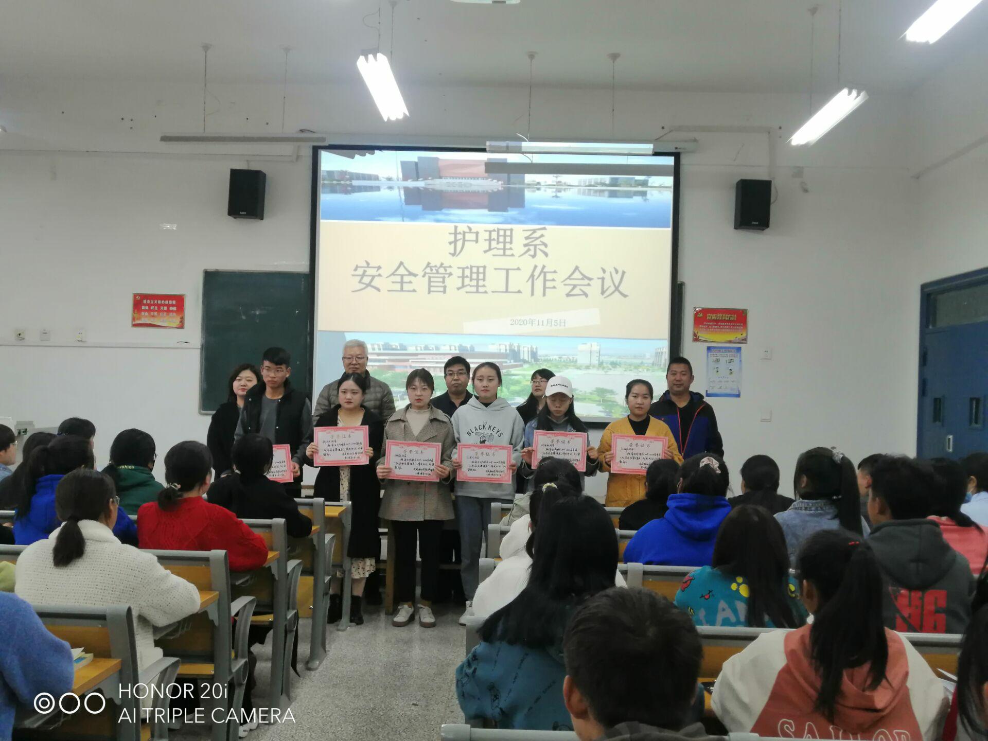 會(huì)上,陳鳳平宣讀了《護(hù)理系關(guān)于表彰2019-2020學(xué)年度學(xué)生優(yōu)秀安全管理員的決定》,護(hù)理系書(shū)記張建輝為獲表彰學(xué)生頒發(fā)榮譽(yù)證書(shū)。張學(xué)軍就近期我系存在的安全隱患問(wèn)題作了詳細(xì)的說(shuō)明。張建輝傳達(dá)了學(xué)院召開(kāi)的疫情常態(tài)化防控工作會(huì)議內(nèi)容及相關(guān)文件精神,他指出,全系要進(jìn)一步加強(qiáng)安全隱患排查,尤其是實(shí)驗(yàn)室安全,切實(shí)將安全各項(xiàng)工作措施落到實(shí)處,預(yù)防安全事故的發(fā)生。他強(qiáng)調(diào),全系師生要進(jìn)一步加強(qiáng)學(xué)生身體健康監(jiān)測(cè),尤其是每天的晨午檢、日?qǐng)?bào)告、零報(bào)告,切實(shí)將疫情防控各項(xiàng)工作措施落到實(shí)處;倡導(dǎo)文明就餐,增強(qiáng)節(jié)約意識(shí),實(shí)施“光盤(pán)行動(dòng)”,杜絕浪費(fèi)發(fā)生; 持續(xù)做好宿舍、教室及環(huán)境衛(wèi)生掃除,營(yíng)造良好的學(xué)習(xí)、生活和工作環(huán)境;安全是所有工作的基礎(chǔ)與保障,全體安全員要齊心協(xié)力、攜手努力,除隱患、防火險(xiǎn)、保安全、促和諧,為建設(shè)美好校園戮力奮進(jìn)。