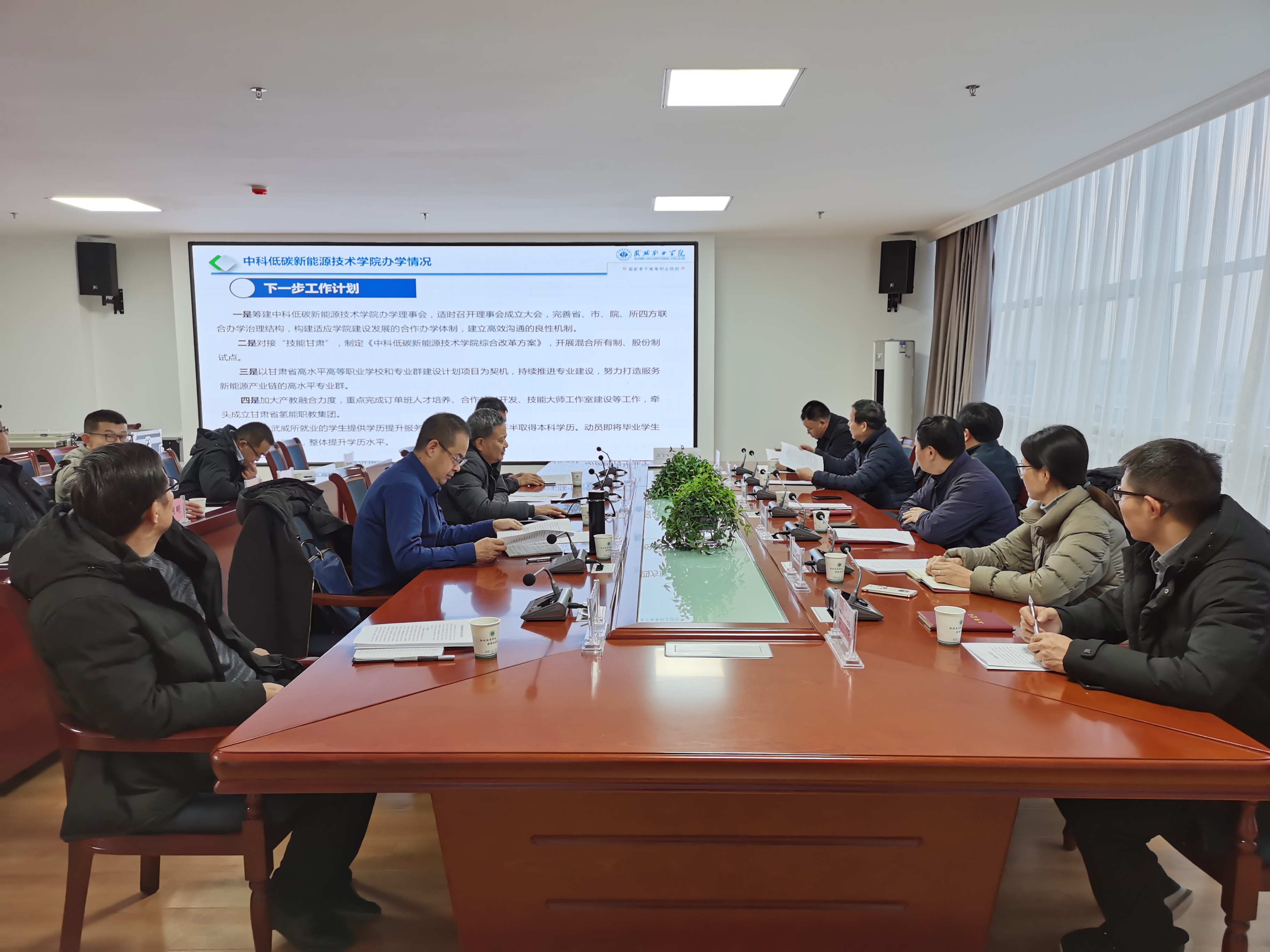 參觀結(jié)束后,學院在能源科技樓811會議召開了中科低碳新能源技術(shù)學院工作座談會。會上,趙明介紹了學院整合教學資源建設(shè)發(fā)展歷程、黨的建設(shè)、優(yōu)質(zhì)校建設(shè)、專業(yè)建設(shè)、合作辦學、師資隊伍建設(shè)、招生就業(yè)、科研服務(wù)、對外交流、校企合作和“雙高”院校創(chuàng)建等情況。重點就中科低碳新能源技術(shù)學院建設(shè)發(fā)展、專業(yè)申報、實驗實訓室建設(shè)、教育教學、人才培養(yǎng)和下一步工作計劃等情況進行了詳細介紹。