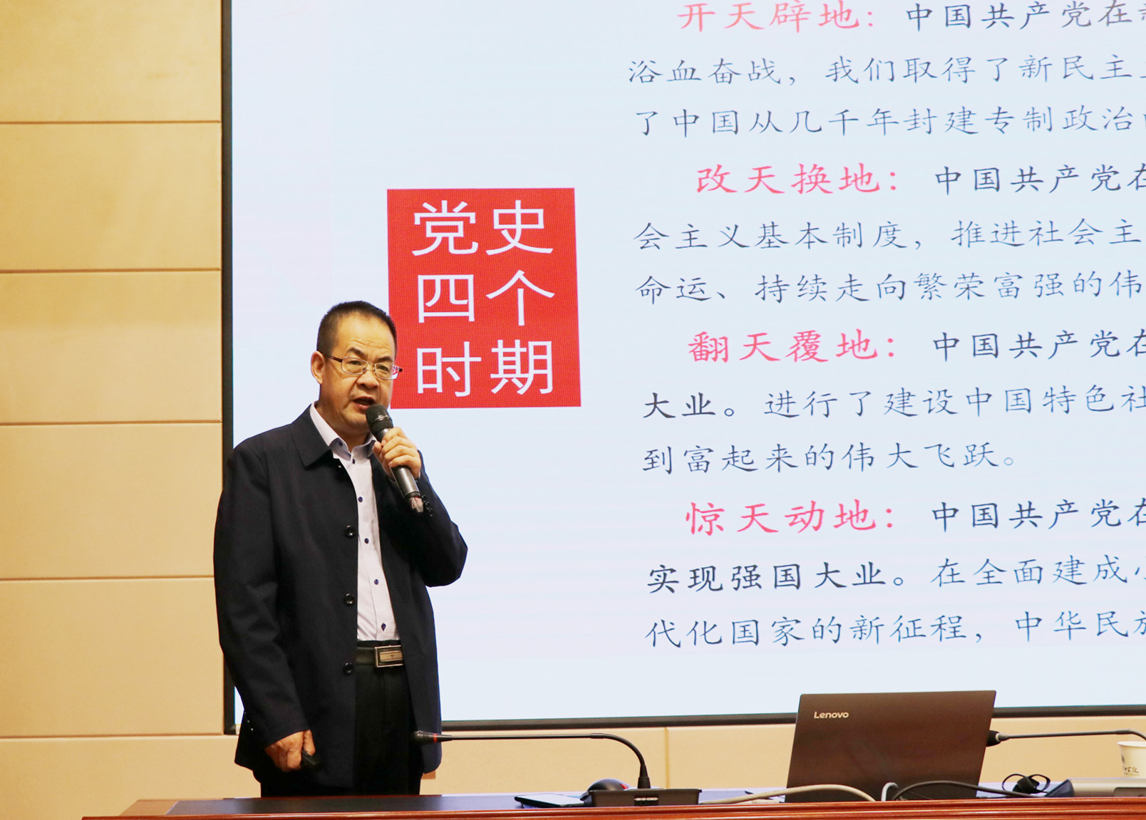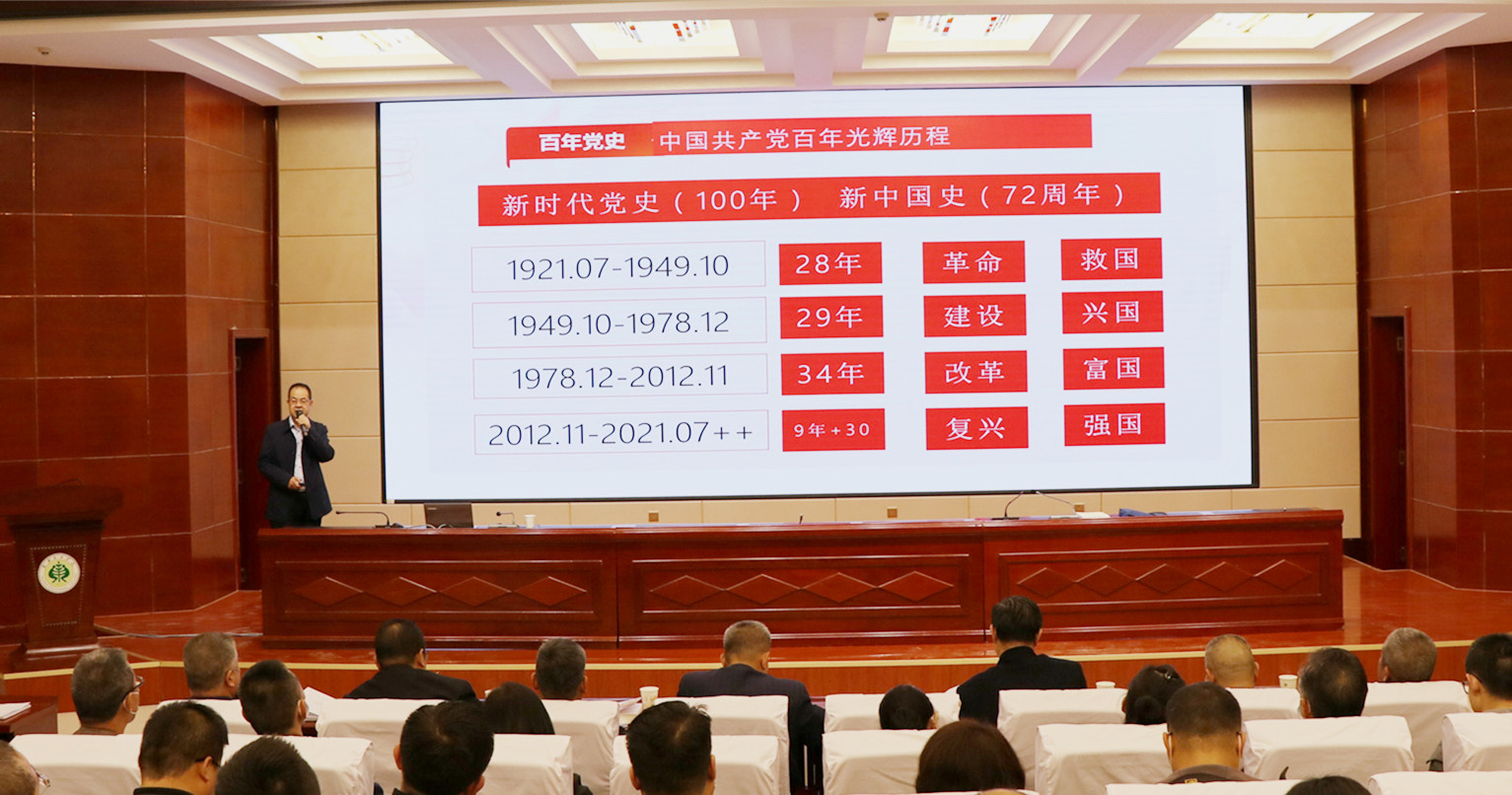 報(bào)告中,翟存祥教授帶領(lǐng)大家再次學(xué)習(xí)了習(xí)近平總書記在黨史學(xué)習(xí)教育動(dòng)員大會(huì)上的講話,進(jìn)一步明確了開展黨史學(xué)習(xí)教育的重大意義。報(bào)告將中國共產(chǎn)黨百年歷程分為“開天辟地,新民主主義革命時(shí)期;改天換地,社會(huì)主義革命和建設(shè)時(shí)期;翻天覆地,改革開放和現(xiàn)代化建設(shè)時(shí)期;驚天動(dòng)地,中國特色社會(huì)主義新時(shí)代”四個(gè)歷史發(fā)展階段。從只有中國共產(chǎn)黨才能拯救中國,中國人民站起來了;只有中國共產(chǎn)黨才能發(fā)展中國,中國人民富起來了;只有中國共產(chǎn)黨才能治理中國,中國人民強(qiáng)起來了;堅(jiān)持中國共產(chǎn)黨的全面領(lǐng)導(dǎo),新中國取得巨大成就等四個(gè)方面深刻闡述了中國共產(chǎn)黨百年奮斗的光輝歷程和取得的偉大成就,系統(tǒng)梳理總結(jié)了黨帶領(lǐng)人民推進(jìn)革命、建設(shè)、改革的寶貴經(jīng)驗(yàn)和長(zhǎng)期奮斗中鑄就的偉大精神。