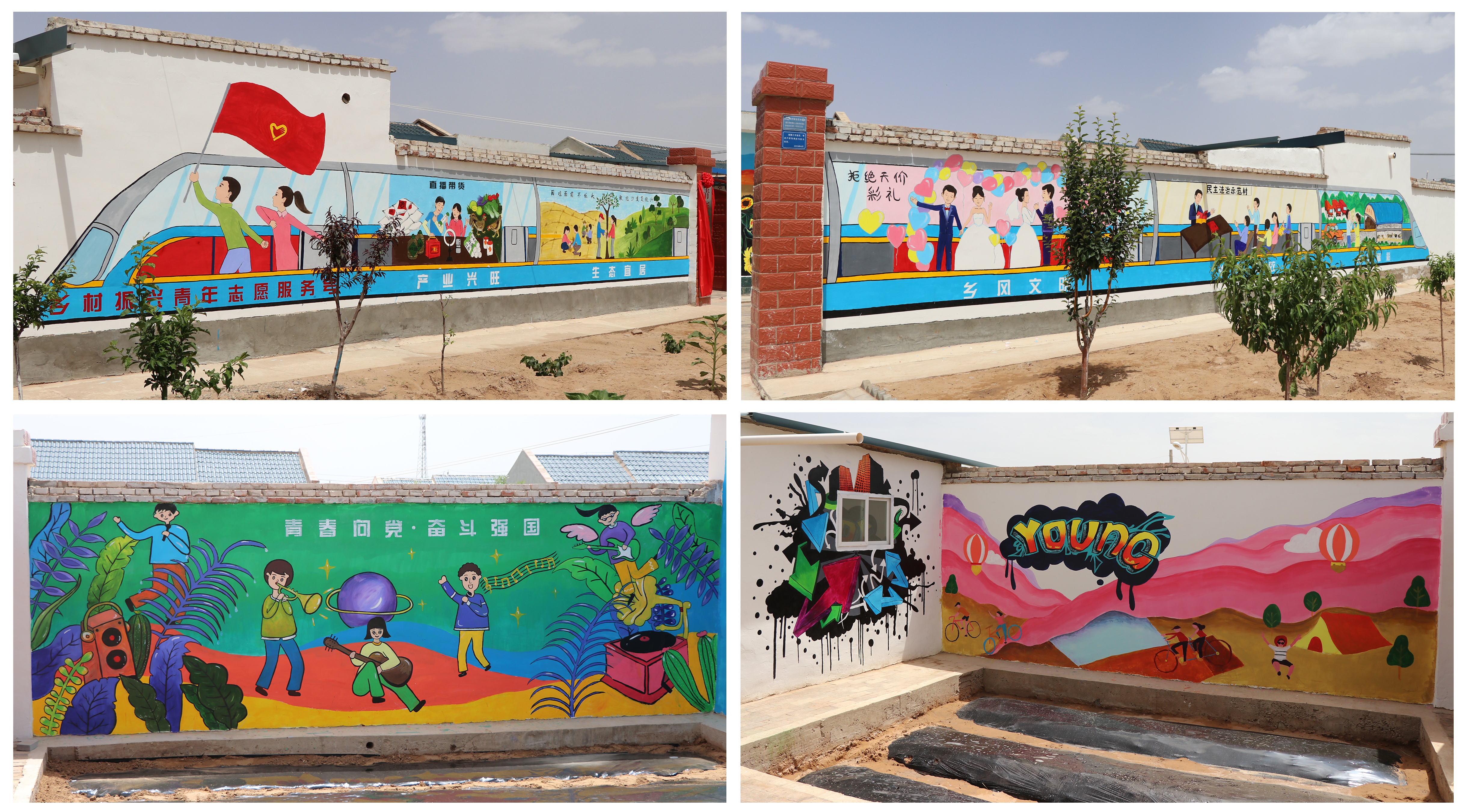 學院團委結合鄉(xiāng)村振興戰(zhàn)略和青年志愿服務工作特點對基地內外墻體進行了彩繪設計,并組織人文藝術教育系師生完成了手工繪制。外墻以鄉(xiāng)村振興青年志愿服務號高速列車為主題,融入了鄉(xiāng)村振興戰(zhàn)略20字方針,產業(yè)興旺、生態(tài)宜居、鄉(xiāng)風文明、治理有效、生活富裕5個方面的總體目標。內墻以青春時尚為主題,利用涂鴉的形式,展現(xiàn)青年人朝氣蓬勃、積極向上,青春向黨、奮斗強國的精神風貌。