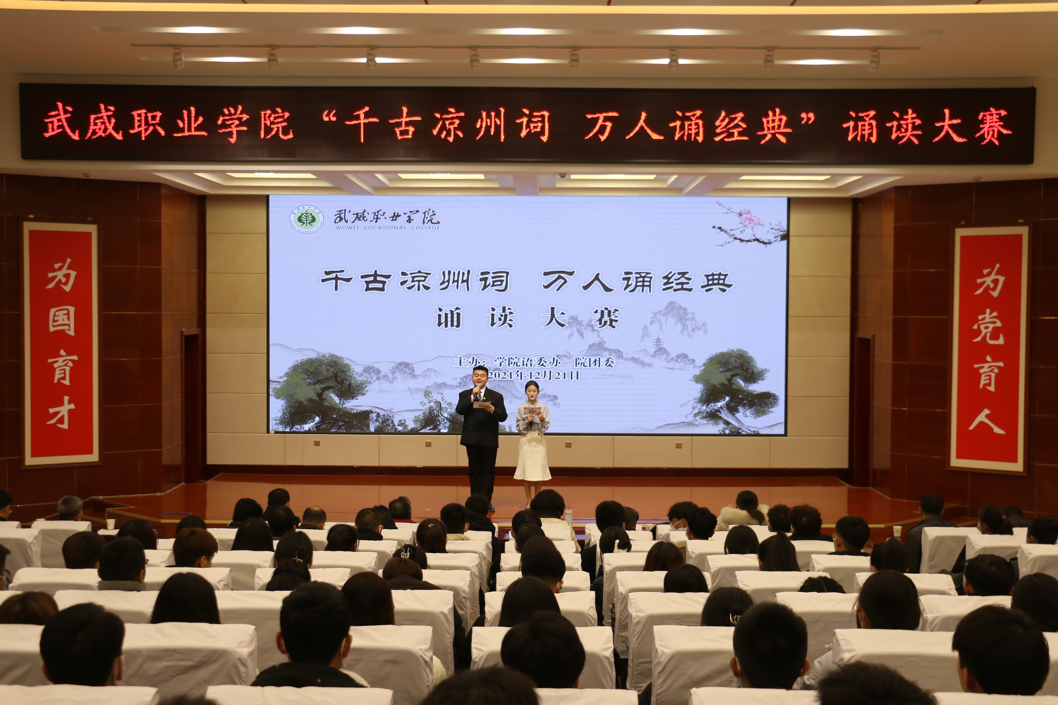 為深化黨史學(xué)習(xí)教育,推進“雙高計劃”建設(shè)任務(wù),弘揚涼州文化,傳承絲路精神,助推全國文明城市創(chuàng)建,營造書香校園氛圍,12月21日晚,學(xué)院“千古涼州詞 萬人誦經(jīng)典”誦讀大賽在菁英廳舉辦,學(xué)院黨委書記、院長趙明,黨委委員、副院長張開禮,黨委委員、副院長王守云出席活動,各分團委書記及學(xué)生代表250余人觀看比賽。