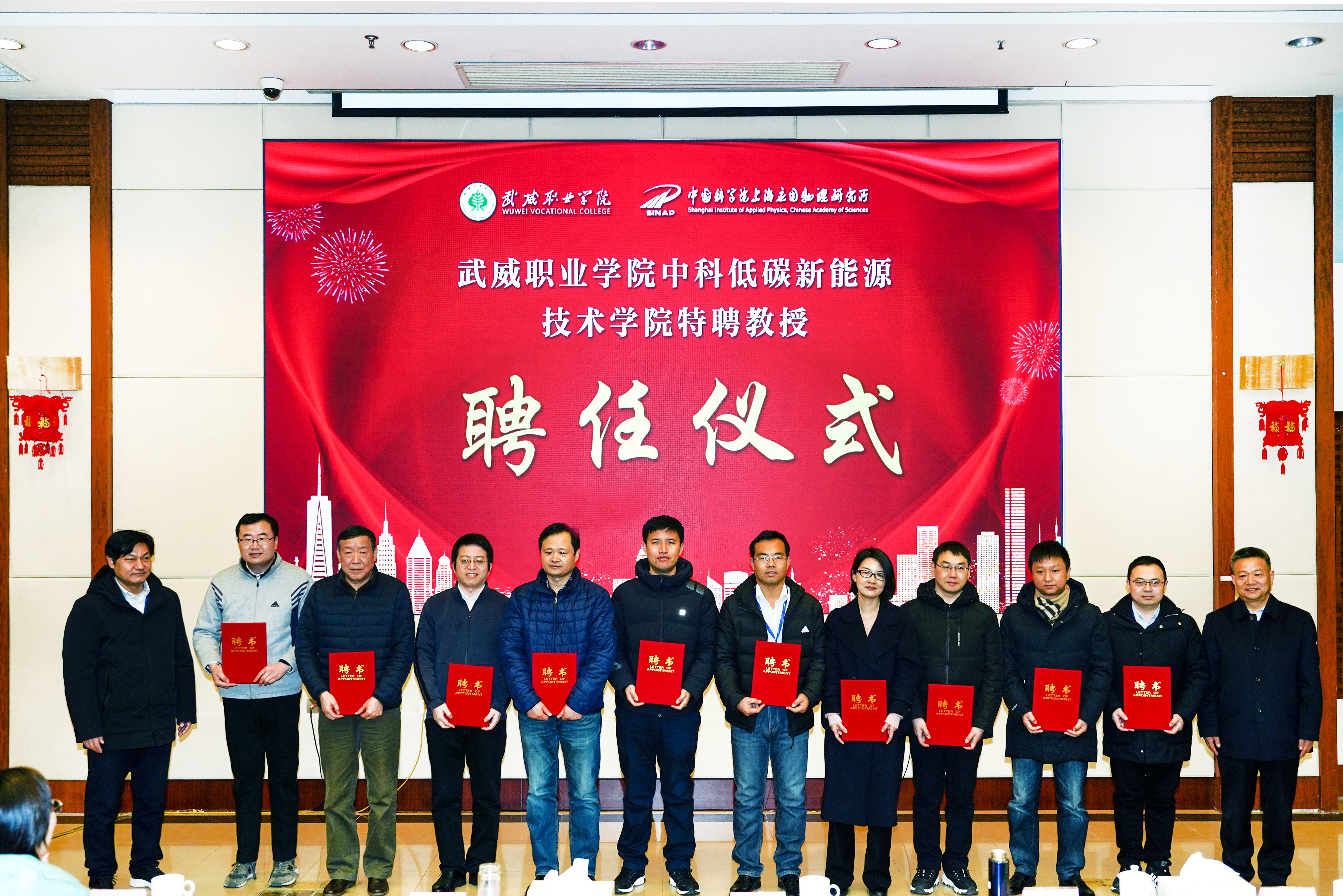 ??聘任儀式上,學(xué)院黨委副書記翟存祥宣讀了《武威職業(yè)學(xué)院 中國科學(xué)院上海應(yīng)用物理研究所關(guān)于續(xù)聘楊存忠等17名同志擔(dān)任中科低碳新能源技術(shù)學(xué)院特聘教授的通知》。隨后,上海應(yīng)用物理研究所所長戴志敏,學(xué)院黨委書記、院長趙明向17名特聘教授頒發(fā)了聘書。