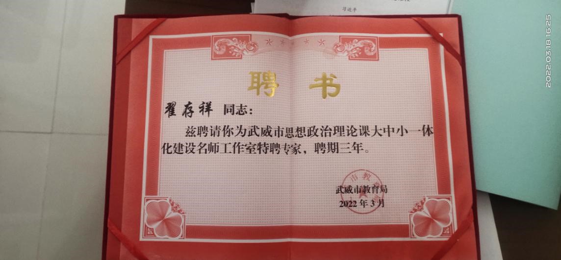 會議學習了習近平總書記在學校思想政治理論課教師座談會上的重要講話精神,總結了近年來武威市思政課建設取得的成績,各縣區(qū)交流了經(jīng)驗做法,安排部署了下一階段工作。同時,舉行了武威市思想政治理論課大中小一體化建設名師工作室授牌和名師工作室特聘專家聘任儀式。學校思政課名師工作室負責人、黨委副書記翟存祥教授被聘為武威市思想政治理論課大中小一體化建設名師工作室特聘專家。