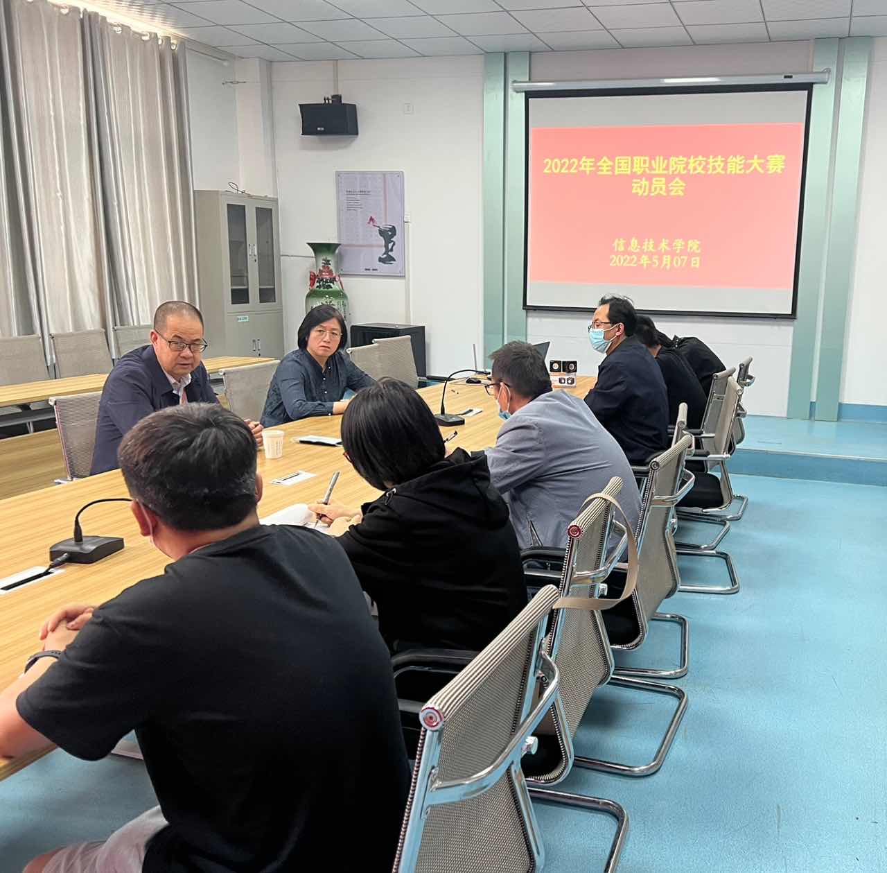 為貫徹落實“技能甘肅”“技能武威”工作任務(wù),全力以赴推進學(xué)校高質(zhì)量發(fā)展,加強學(xué)生技能水平,全力做好2022年全國職業(yè)院校技能大賽備賽工作,5月7日,2022年全國職業(yè)院校技能大賽動員會在信息技術(shù)學(xué)院明德樓409會議室召開。學(xué)校黨委副書記翟存祥、信息技術(shù)學(xué)院院長李亞梅、2個國賽參賽隊的全體指導(dǎo)老師和學(xué)生參加本次會議。
