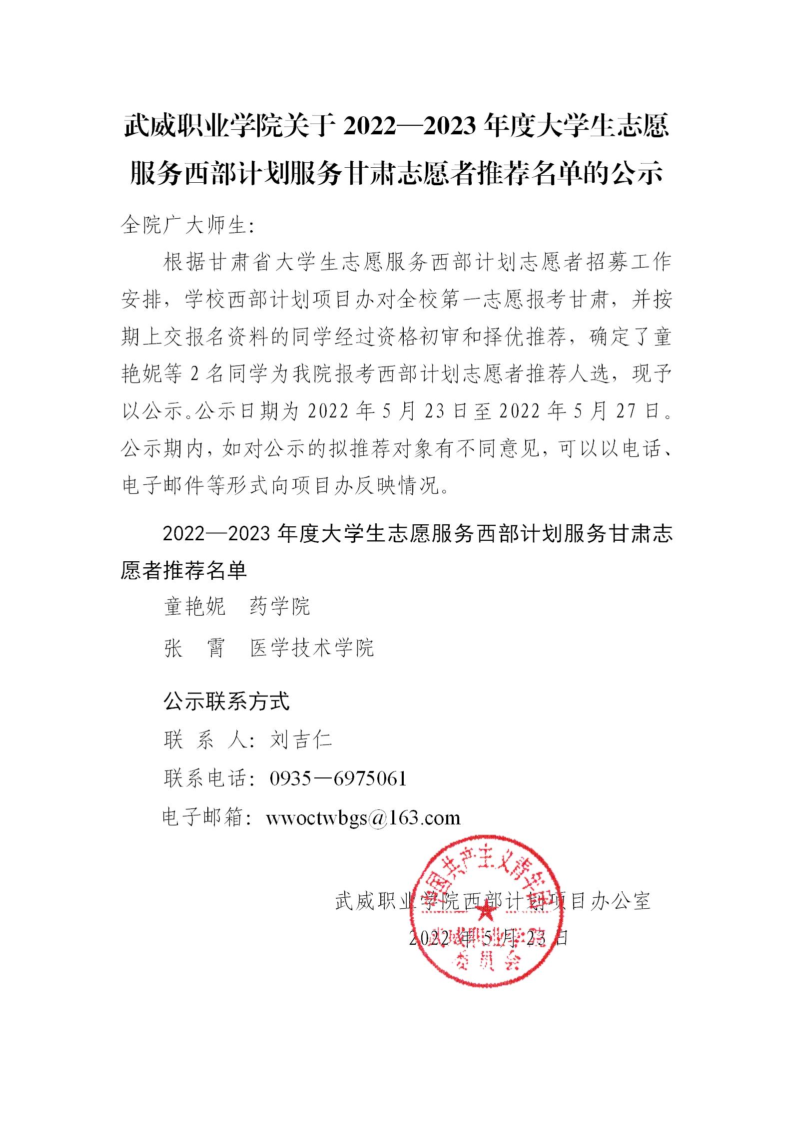 武威職業(yè)學院關于2022—2023年度大學生志愿服務西部計劃服務甘肅志愿者推薦名單的公示