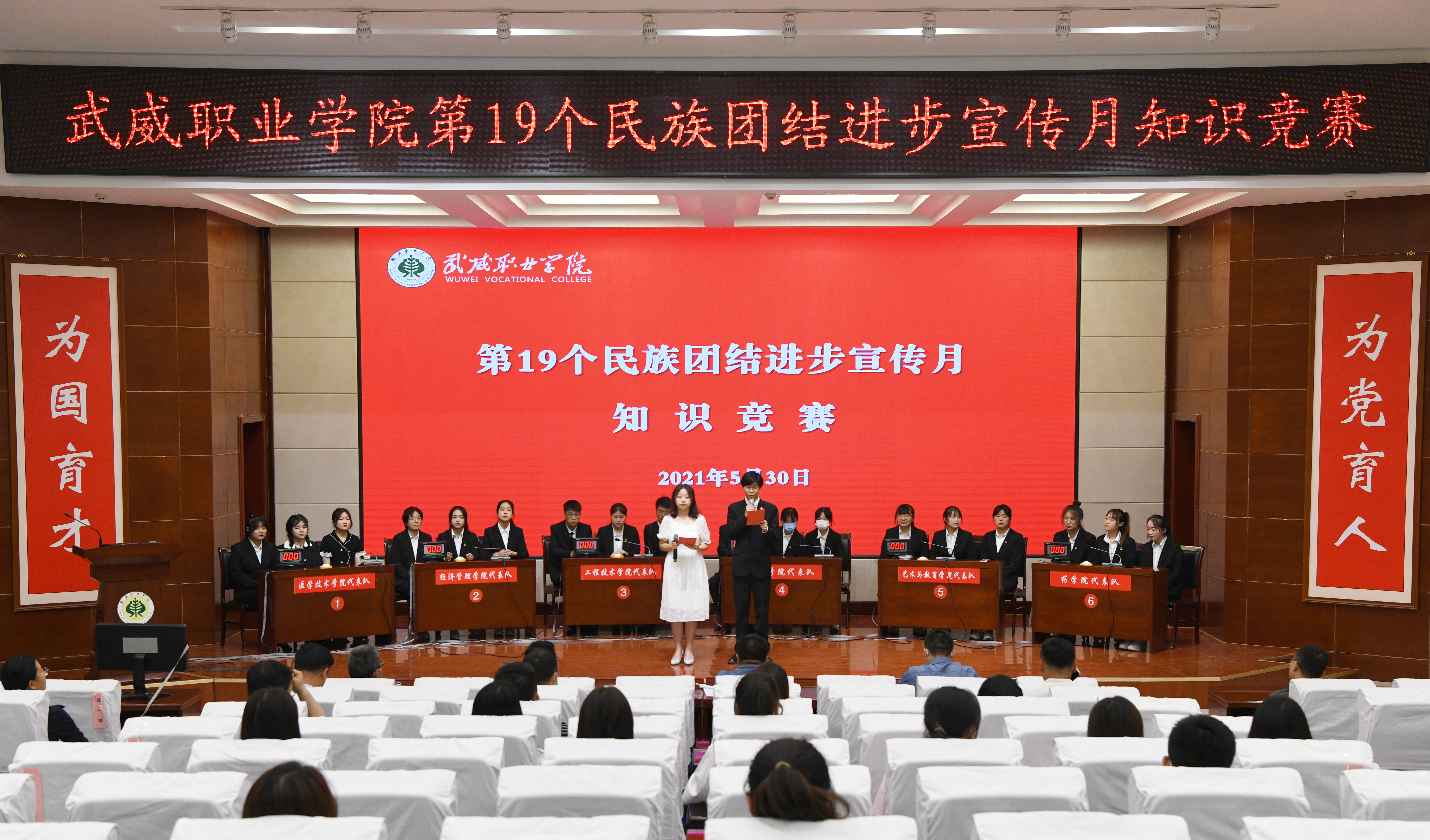 經(jīng)過前期的初賽、復(fù)賽,共有6支參賽隊(duì)進(jìn)入知識(shí)競賽決賽,競賽內(nèi)容涵蓋了習(xí)近平新時(shí)代中國特色社會(huì)主義思想、中央民族工作會(huì)議精神、中華民族歷史發(fā)展知識(shí)、各民族優(yōu)秀傳統(tǒng)文化、中國夢等方面內(nèi)容,充分彰顯了中華民族一家親、同心共筑中夢的精神。競賽中,參賽選手以飽滿的精神,踴躍答題,你追我趕,氣氛十分熱烈。經(jīng)過激烈的角逐,藥學(xué)院獲得此次知識(shí)競賽第一名。醫(yī)學(xué)技術(shù)學(xué)院獲得學(xué)校第19個(gè)民族團(tuán)結(jié)進(jìn)步宣傳月系列活動(dòng)優(yōu)秀組織獎(jiǎng)。