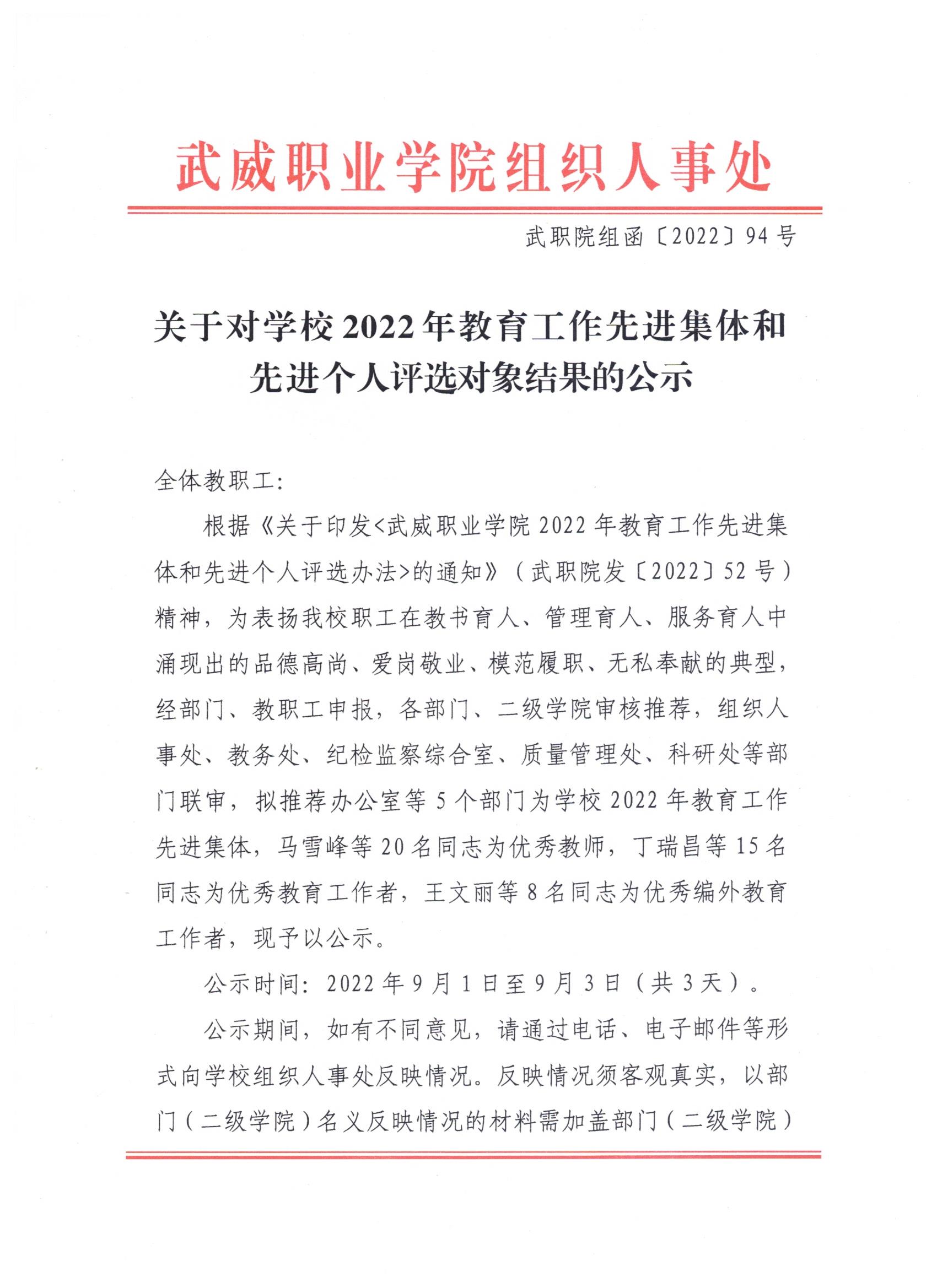 關(guān)于對學(xué)校2022年教育工作先進(jìn)集體和先進(jìn)個(gè)人評選對象結(jié)果的公示