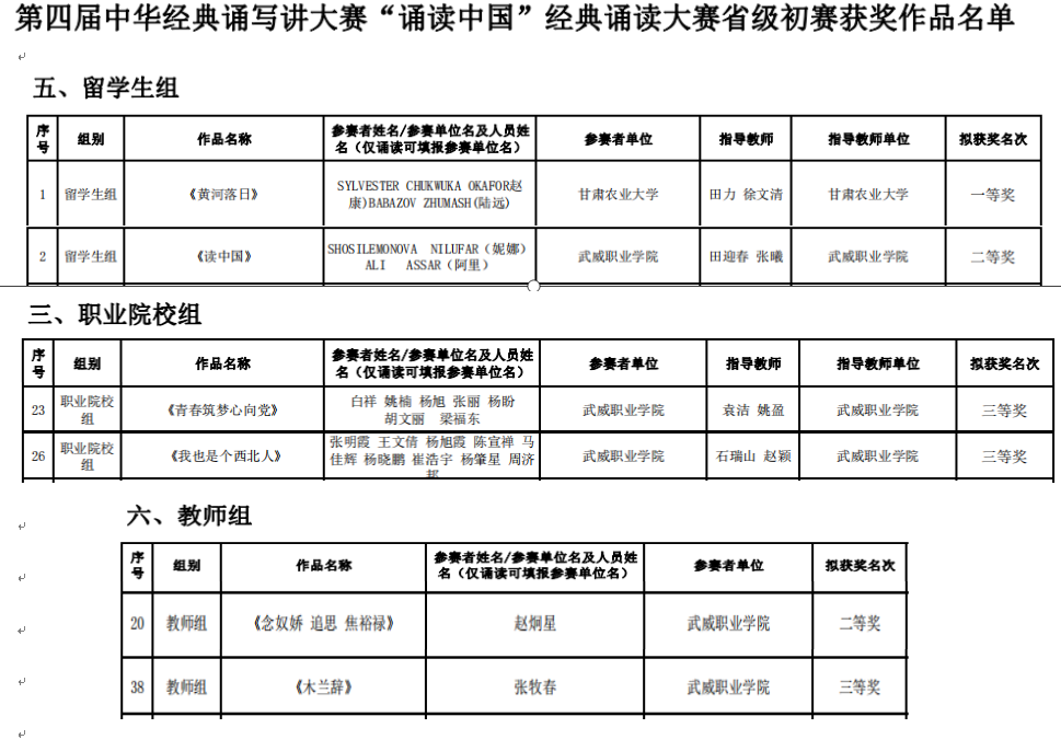 今日,甘肅省教育廳下發(fā)《甘肅省語言文字工作委員會 甘肅省教育廳關(guān)于公布第四屆中華經(jīng)典誦寫講大賽“誦讀中國”經(jīng)典誦讀大賽及“筆墨中國”漢字書寫大賽省級初賽獲獎作品名單的通知》,學校選送的留學生組作品《讀中國》榮獲二等獎,并由省教育廳推送參加國賽誦讀大賽;