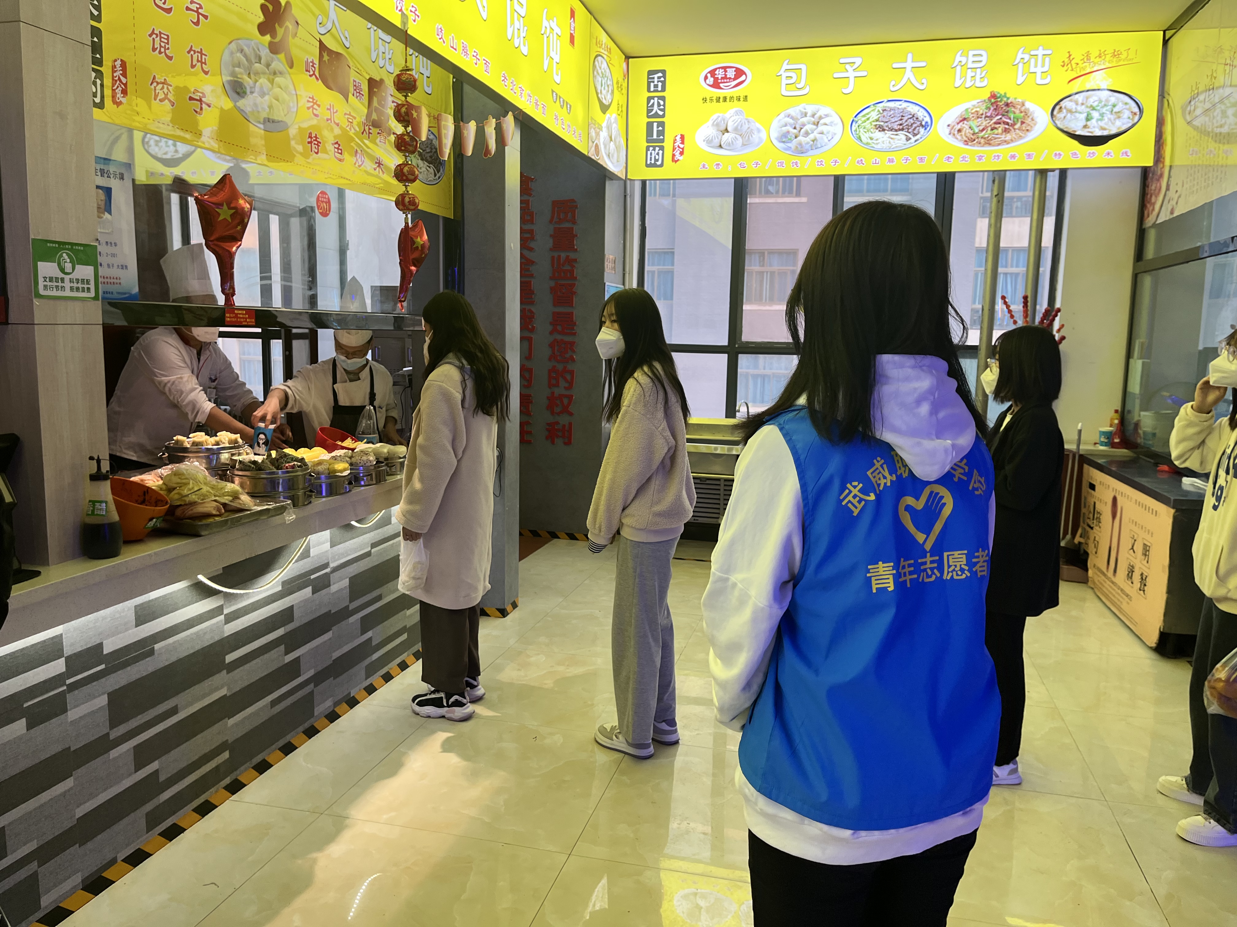 從學(xué)校實(shí)行最小單元宿舍管理開(kāi)始,各學(xué)生組織工作人員分批次、不間斷、輪流值守,他們主動(dòng)亮身份、帶頭當(dāng)先鋒,在校園食堂、水房、超市等人流容易聚集的地方,每天安排志愿者在人流高峰時(shí)間段排班站崗,勸導(dǎo)同學(xué)們遵守疫情防控一米線,不扎堆不聚集,積極佩戴好口罩,做好個(gè)人防護(hù)工作,確保同學(xué)們吃飯、購(gòu)物、打水健康有序進(jìn)行。在對(duì)可能傳入疫情的校園圍欄處開(kāi)展值守勸阻工作,積極勸導(dǎo)學(xué)生不購(gòu)買社會(huì)面商品,堅(jiān)決杜絕疫情從社會(huì)傳入校園,將學(xué)校疫情防控各項(xiàng)措施落細(xì)落實(shí),切實(shí)扛起校園疫情防控責(zé)任。一件件“藍(lán)馬甲”活躍在校園每個(gè)角落,服務(wù)同學(xué)的身影從未間斷,成為校園里一道靚麗的風(fēng)景線,用實(shí)際行動(dòng)詮釋了新時(shí)代武職學(xué)子的責(zé)任與擔(dān)當(dāng)。