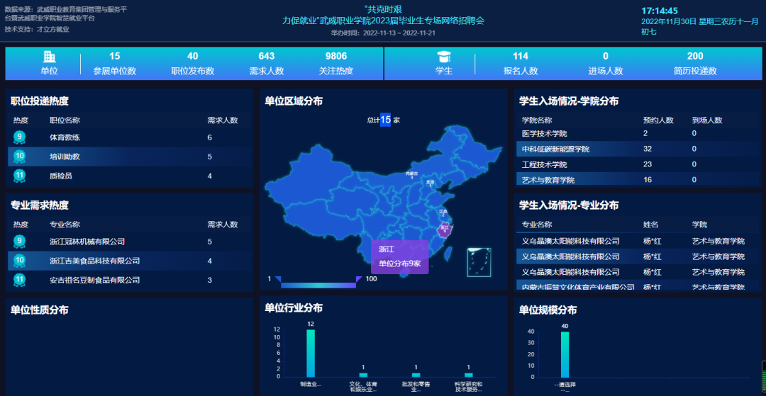 本次云聘系列活動(dòng)分兩個(gè)階段舉行,第一階段為“共克時(shí)艱力促就業(yè)”武威職業(yè)學(xué)院2023屆畢業(yè)生專場(chǎng)網(wǎng)絡(luò)招聘會(huì),于11月7日至11月21日舉行。本次招聘會(huì)主要面向在疫情條件下,能夠?qū)\嚱舆\(yùn)學(xué)生赴企業(yè)就業(yè)的單位。湖州市安吉縣人力資源和社會(huì)保障局組織10余家當(dāng)?shù)仄髽I(yè)參加了本次招聘會(huì),同時(shí)吸引內(nèi)蒙古靈圣作物科技有限公司、江蘇京東信息技術(shù)有限公司、義烏晶澳太陽(yáng)能科技有限公司、內(nèi)蒙古振慧文化體育產(chǎn)業(yè)有限公司等企業(yè)參加,提供招聘職位40個(gè),需求人數(shù)643人,招聘會(huì)關(guān)注人次達(dá)9806,200余人投遞簡(jiǎn)歷。