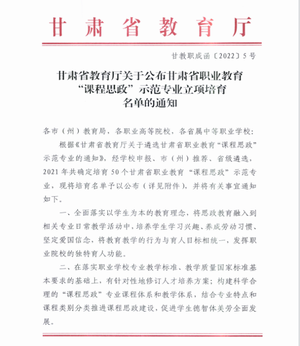 ? 近日,教育廳公布了2021年“技能甘肅”內(nèi)涵項目評審結果,中科低碳新能源技術學院申報的甘肅省職業(yè)教育“課程思政”示范專業(yè)、甘肅省職業(yè)教育在線精品課程、甘肅省職業(yè)教育名師工作室均獲評。