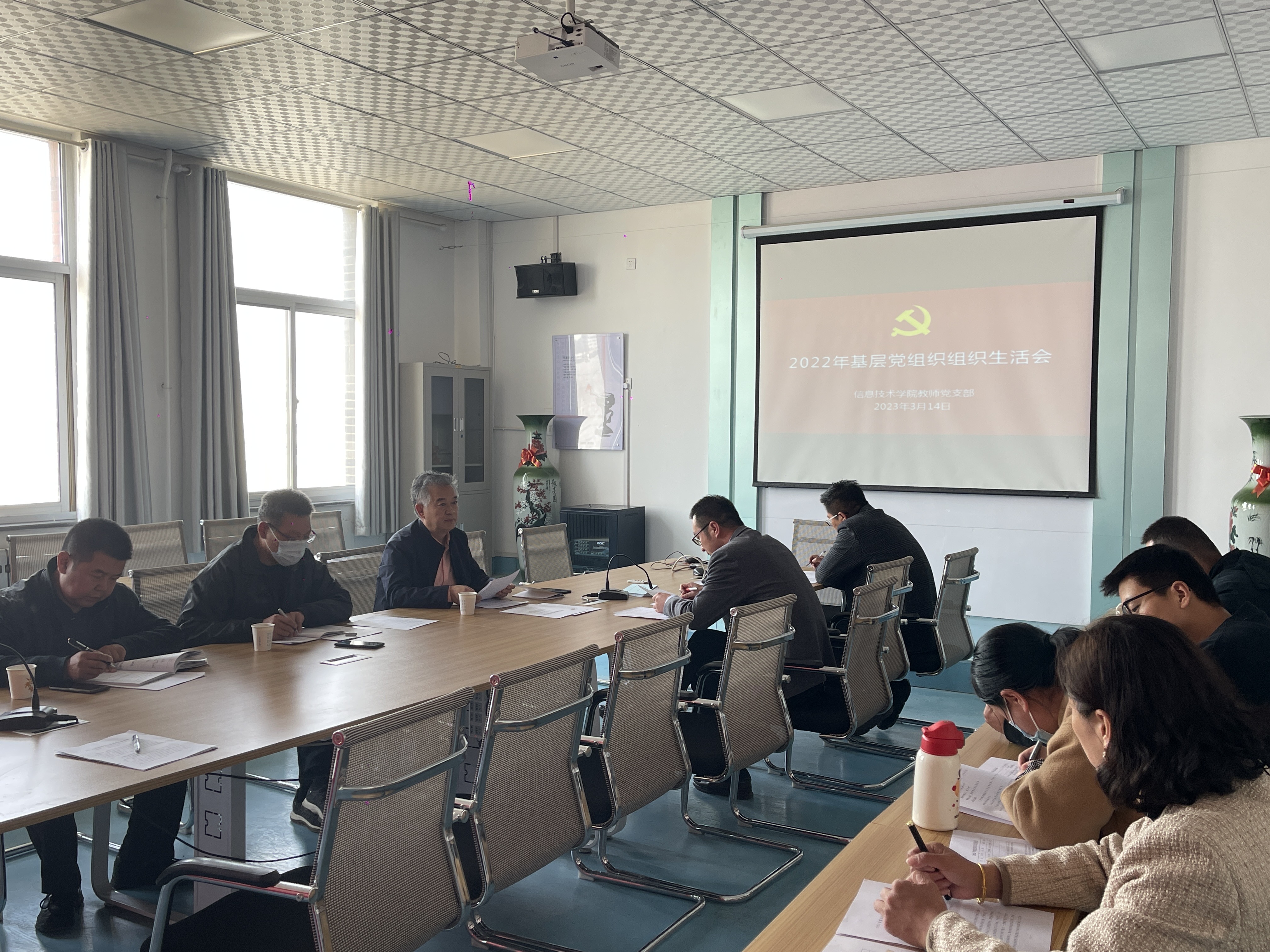 3月14日,信息技術學院黨總支組織教師和學生黨支部分別召開2022年度基層黨組織組織生活會。會議由各支部書記主持,學校黨委委員、副校長王永緒,后勤管理處負責人藺生武、后勤管理處副處長單光年對組織生活會進行督導。