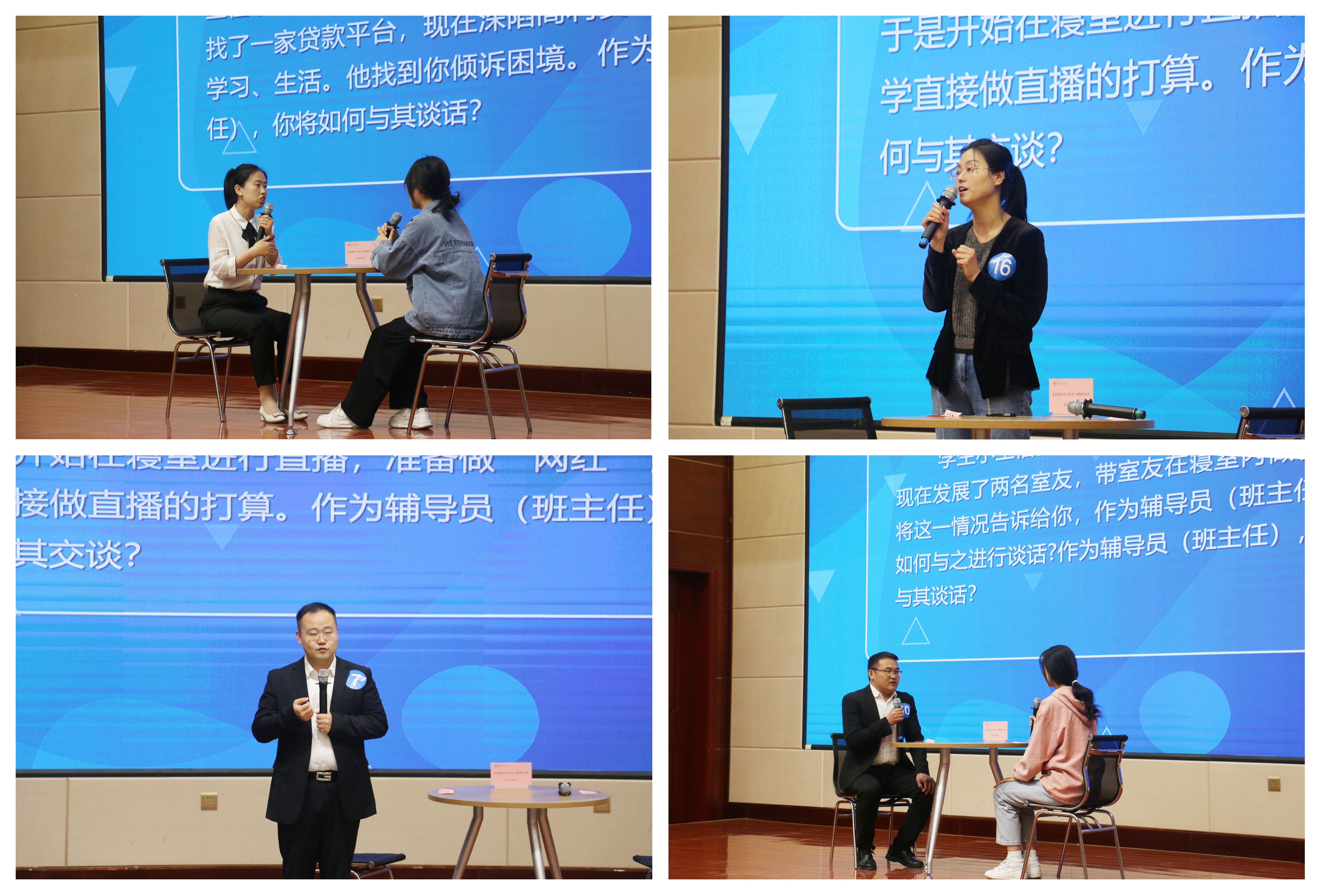 4月20日,談心談話環(huán)節(jié)在菁英廳進(jìn)行。比賽中,面對“問題百變”的參演學(xué)生,參賽選手從學(xué)生特征、學(xué)生成長、成才規(guī)律等方面進(jìn)行了耐心、細(xì)致的談心談話,充分展示了輔導(dǎo)員、班主任對學(xué)生的教育引導(dǎo)、解決思想困惑和處理實(shí)際問題的能力。