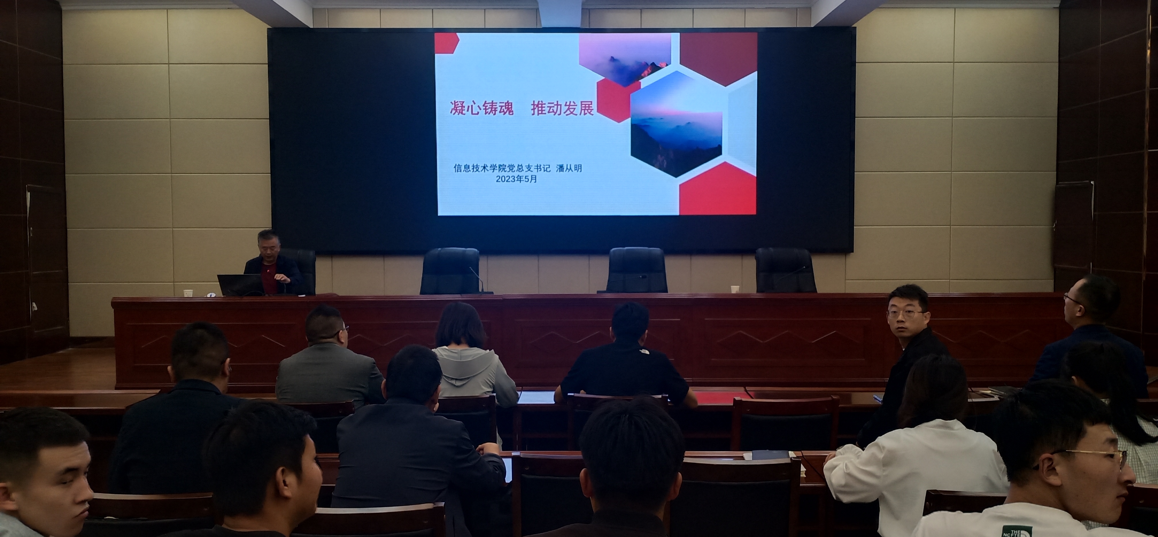 5月25日,信息技術學院黨總支開展學習貫徹習近平新時代中國特色社會主義思想主題教育專題黨課。黨總支書記潘從明以《凝心鑄魂 推動發(fā)展》為題講授主題教育專題黨課,全體師生黨員參加會議。