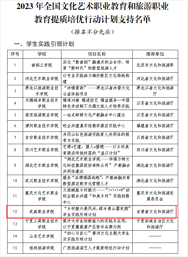 6月8日,文化和旅游部公布2023年全國文化藝術職業(yè)教育和旅游職業(yè)教育提質(zhì)培優(yōu)行動計劃入選名單,我校申報的學生實踐引領計劃項目成功入選,是甘肅省唯一入選項目,全國僅15家單位入選。
