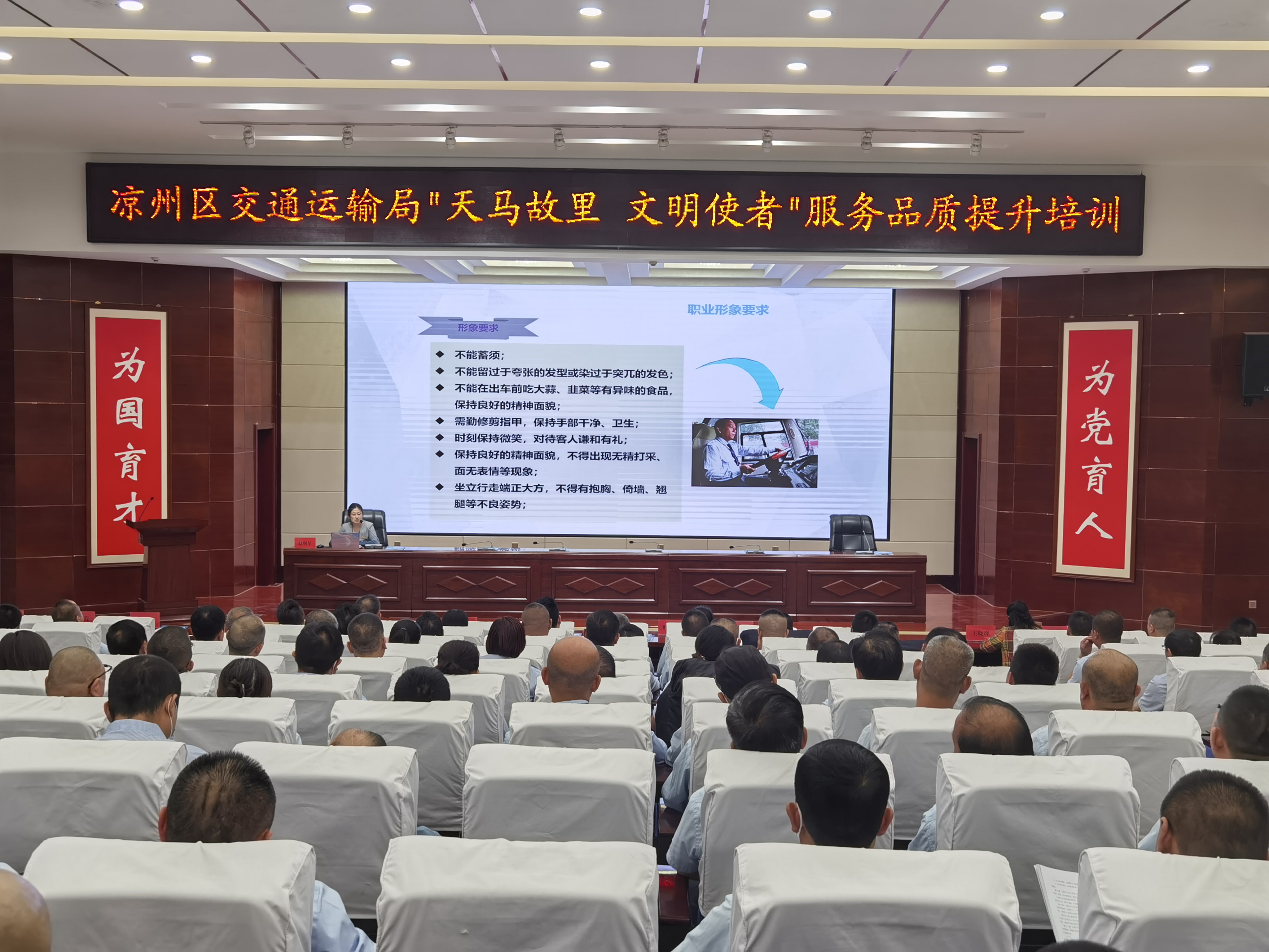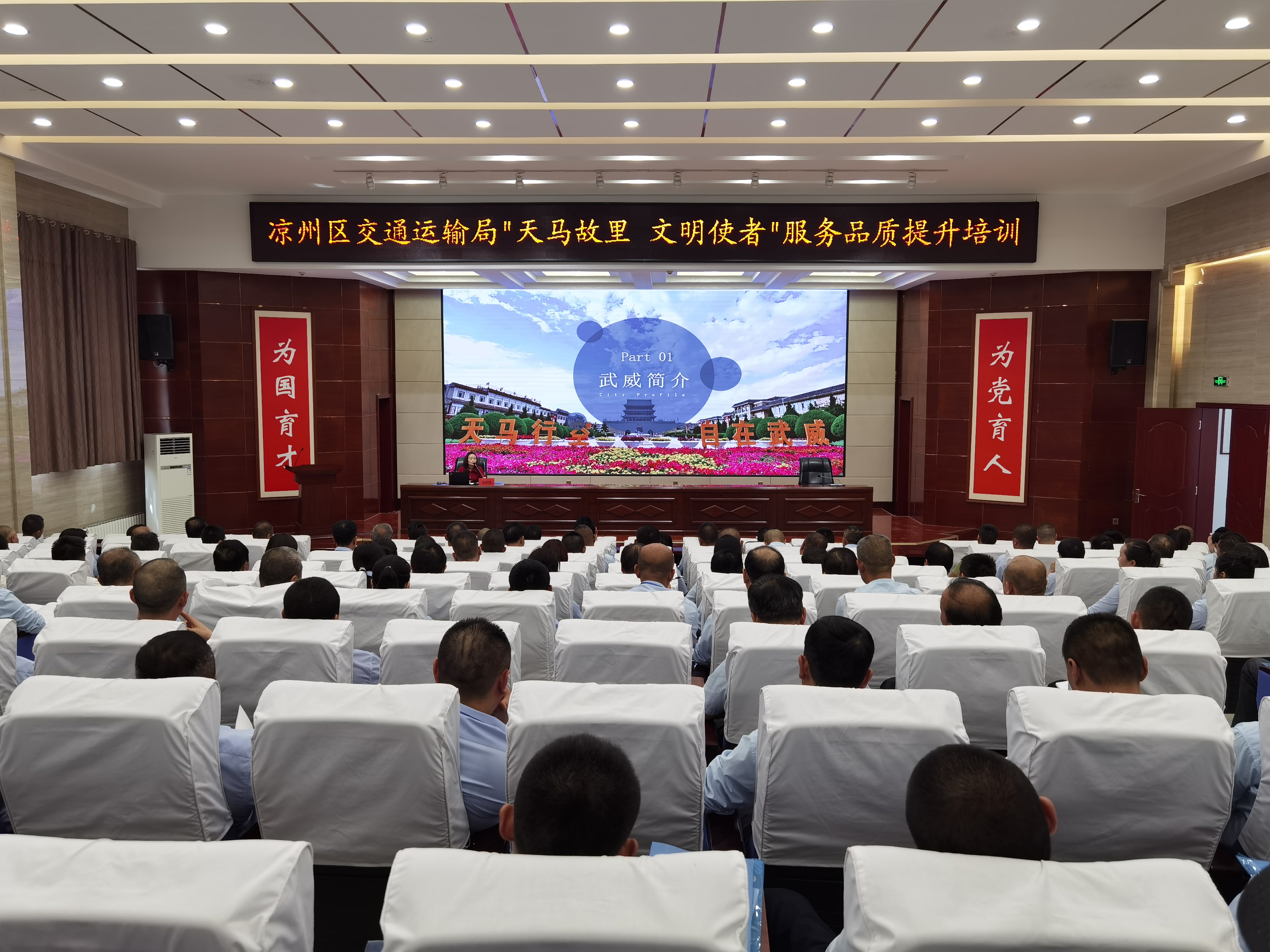 6月28日,“天馬故里 文明使者”客運(yùn)企業(yè)從業(yè)人員服務(wù)品質(zhì)提升培訓(xùn)班在武威職業(yè)學(xué)院開(kāi)班。市交通局副局長(zhǎng)柴天祥,區(qū)委常委、統(tǒng)戰(zhàn)部部長(zhǎng)、區(qū)政協(xié)黨組書(shū)記許娜,市交通運(yùn)輸綜合行政執(zhí)法隊(duì)隊(duì)長(zhǎng)韓世泰,市運(yùn)管局副局長(zhǎng)許培明,學(xué)校黨委委員、副校長(zhǎng)王守云出席開(kāi)班儀式。開(kāi)班式由涼州區(qū)交通運(yùn)輸局副局長(zhǎng)蘇銀堂主持,出租客運(yùn)公司、城市公交公司和定制客運(yùn)公司管理人員及從業(yè)人員220人參加開(kāi)班儀式。