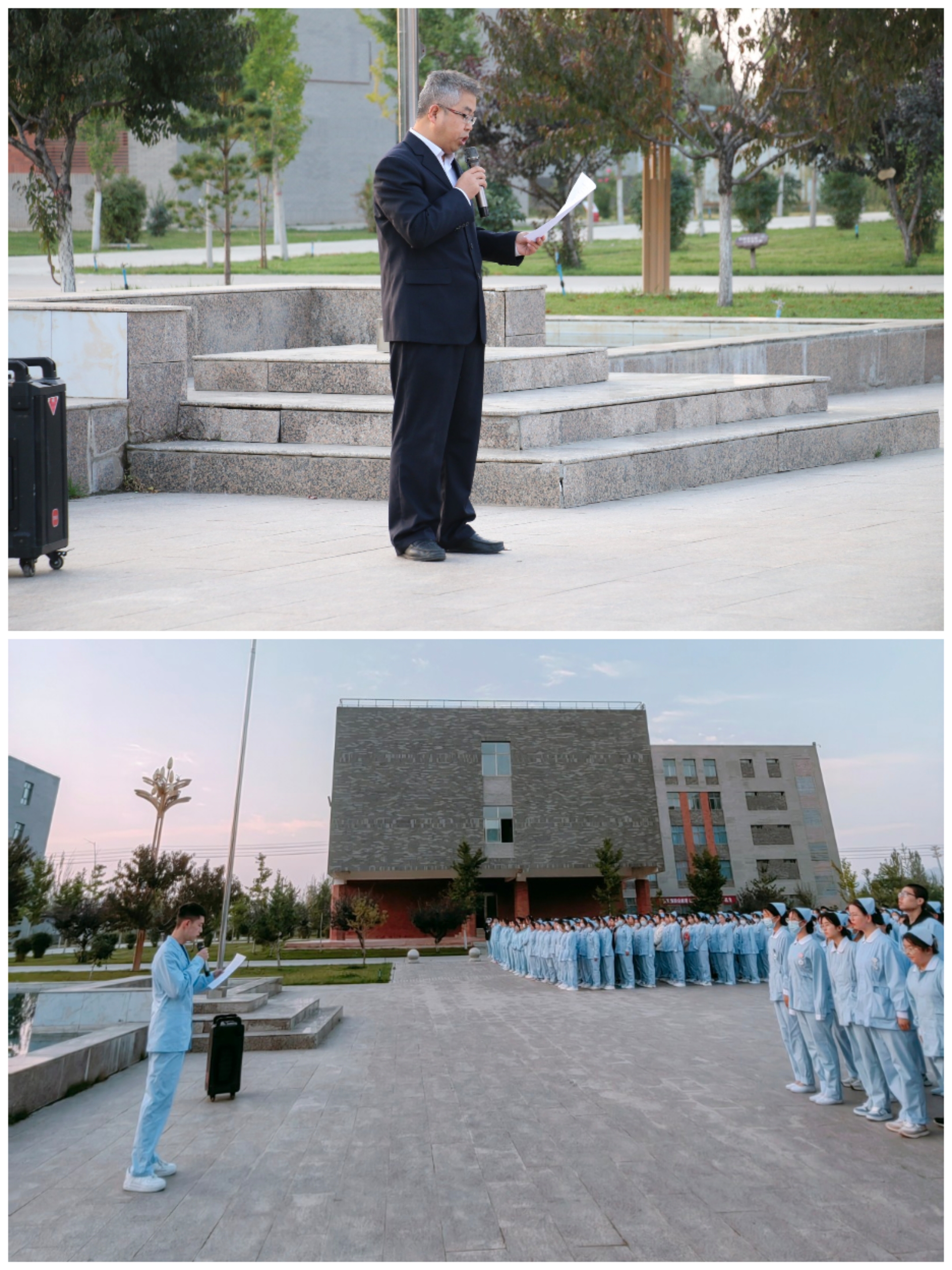 10月9日清晨,護(hù)理學(xué)院在圖書館前廣場舉行升國旗儀式,學(xué)院黨總支書記張建輝、團(tuán)委書記楊杰、全體班主任及2022、2023級全體學(xué)生參加此次升旗儀式,儀式由楊杰主持。