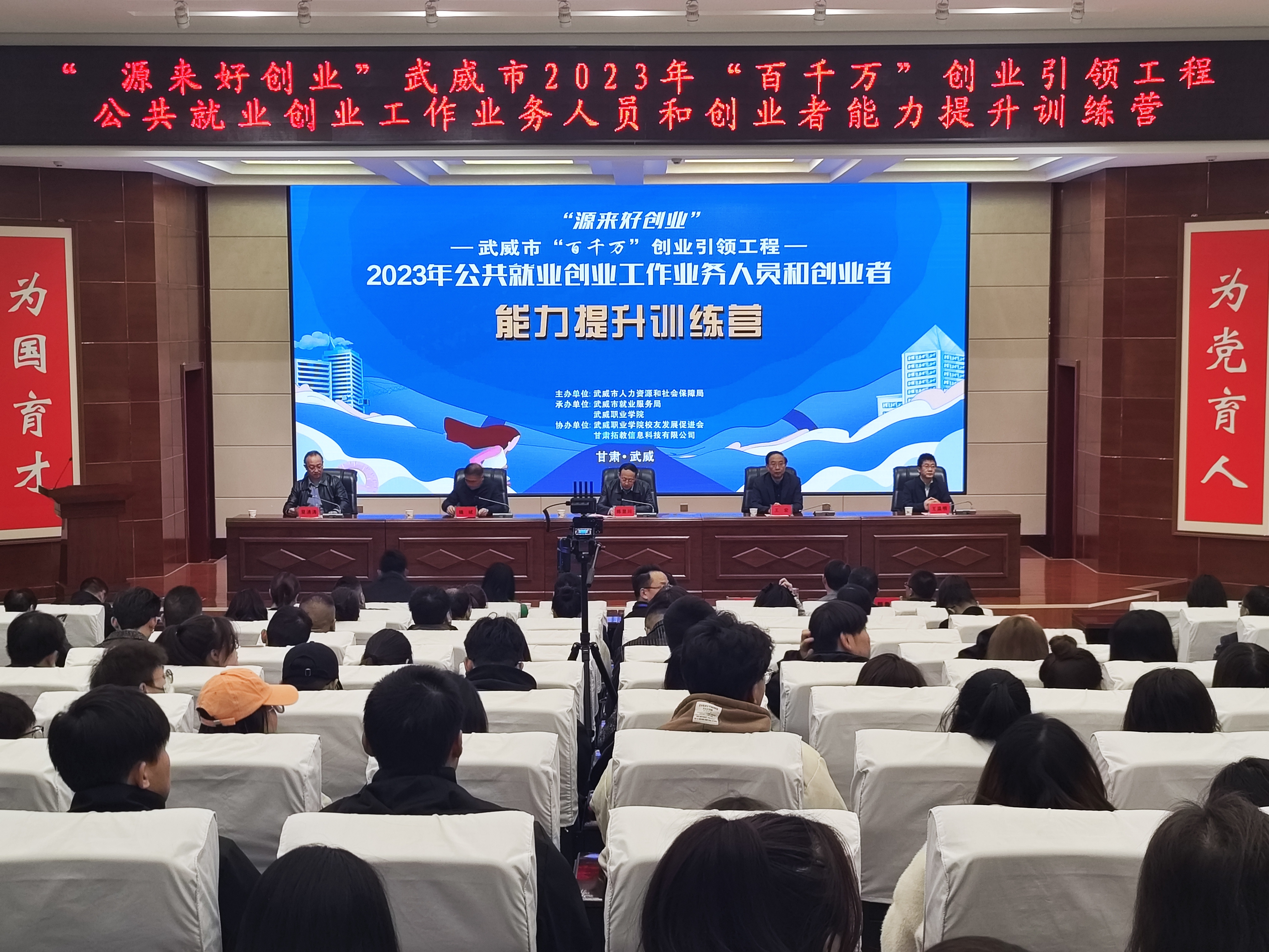 10月24日-26日,由武威市人社局主辦,我校承辦的武威市2023年“百千萬”創(chuàng)業(yè)引領(lǐng)工程就業(yè)創(chuàng)業(yè)能力提升訓(xùn)練營在菁英廳成功舉辦,武威市人社局黨組書記,局長陳昱川,市人社局黨組成員,市就業(yè)局局長魏斌,學(xué)校黨委書記王宏出席了開營儀式。來自縣區(qū)就業(yè)創(chuàng)業(yè)指導(dǎo)中心負責(zé)人,分管就業(yè)創(chuàng)業(yè)工作的領(lǐng)導(dǎo),就業(yè)創(chuàng)業(yè)工作業(yè)務(wù)骨干,我校學(xué)生代表共200人參加訓(xùn)練營活動。