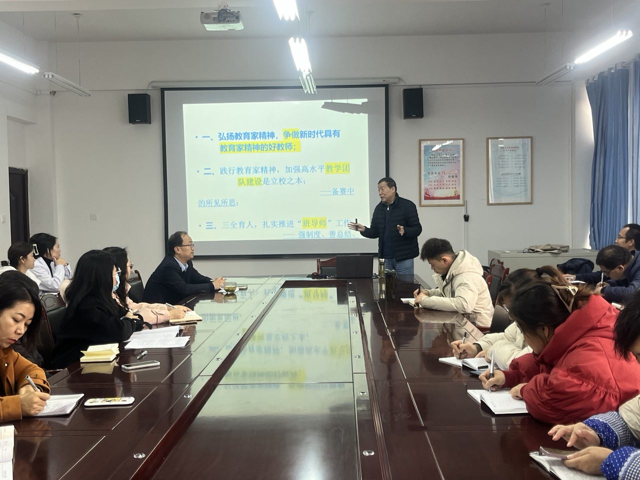楊存忠教授主要從“弘揚(yáng)教育家精神,爭做新時代具有教育家精神的好老師”、“踐行教育家精神,加強(qiáng)高水平教學(xué)團(tuán)隊建設(shè)”、“三全育人,扎實(shí)推進(jìn)班導(dǎo)師工作”以及“如何上好一堂課”四部分展開。楊存忠教授解讀了中國特有教育家精神的內(nèi)涵;闡述了堅持師德師風(fēng)第一標(biāo)準(zhǔn),大力弘揚(yáng)教育家精神的重要意義和基本要求;結(jié)合典型案例,以案為戒,勉勵新時代教師既精通專業(yè)知識、做好“經(jīng)師”,又涵養(yǎng)德行、成為“人師”,努力做精于傳道授業(yè)解惑的“經(jīng)師”和“人師”的統(tǒng)一者。楊存忠教授還就如何上好一堂課與老師們進(jìn)行了深入交流。