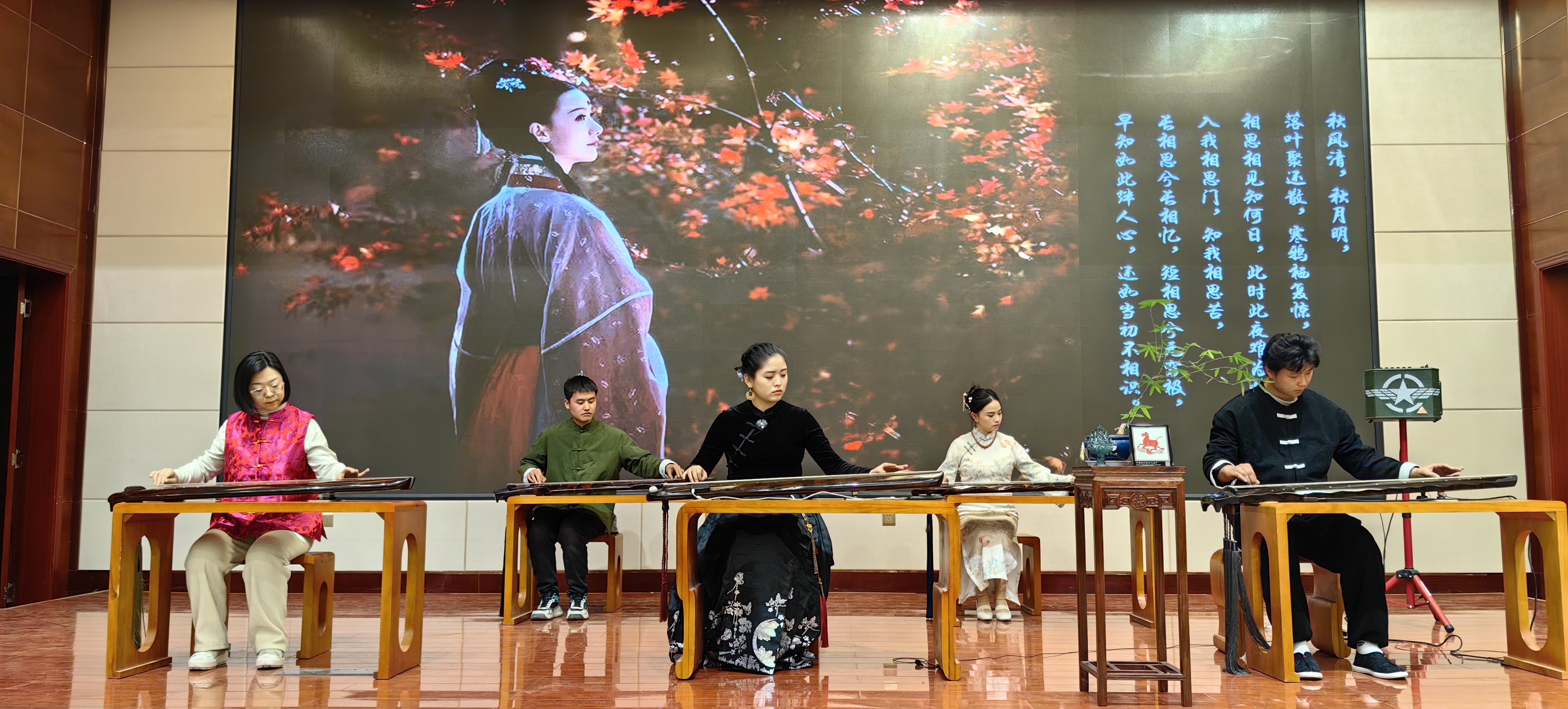 霍宏昌為我校提供的古琴公益課自今年5月開班以來(lái),吸引眾多師生學(xué)習(xí)和關(guān)注。當(dāng)晚,師生們演奏了近期的學(xué)習(xí)成果,隨著《醉漁唱晚》《酒狂》《鳳求凰》《秋風(fēng)詞》《仙翁操》等傳統(tǒng)琴曲的裊裊琴音翩躚入耳,古琴藝術(shù)之美令現(xiàn)場(chǎng)觀眾沉醉,感悟到了人在畫中游、畫在樂中觀的意境和文化內(nèi)涵。