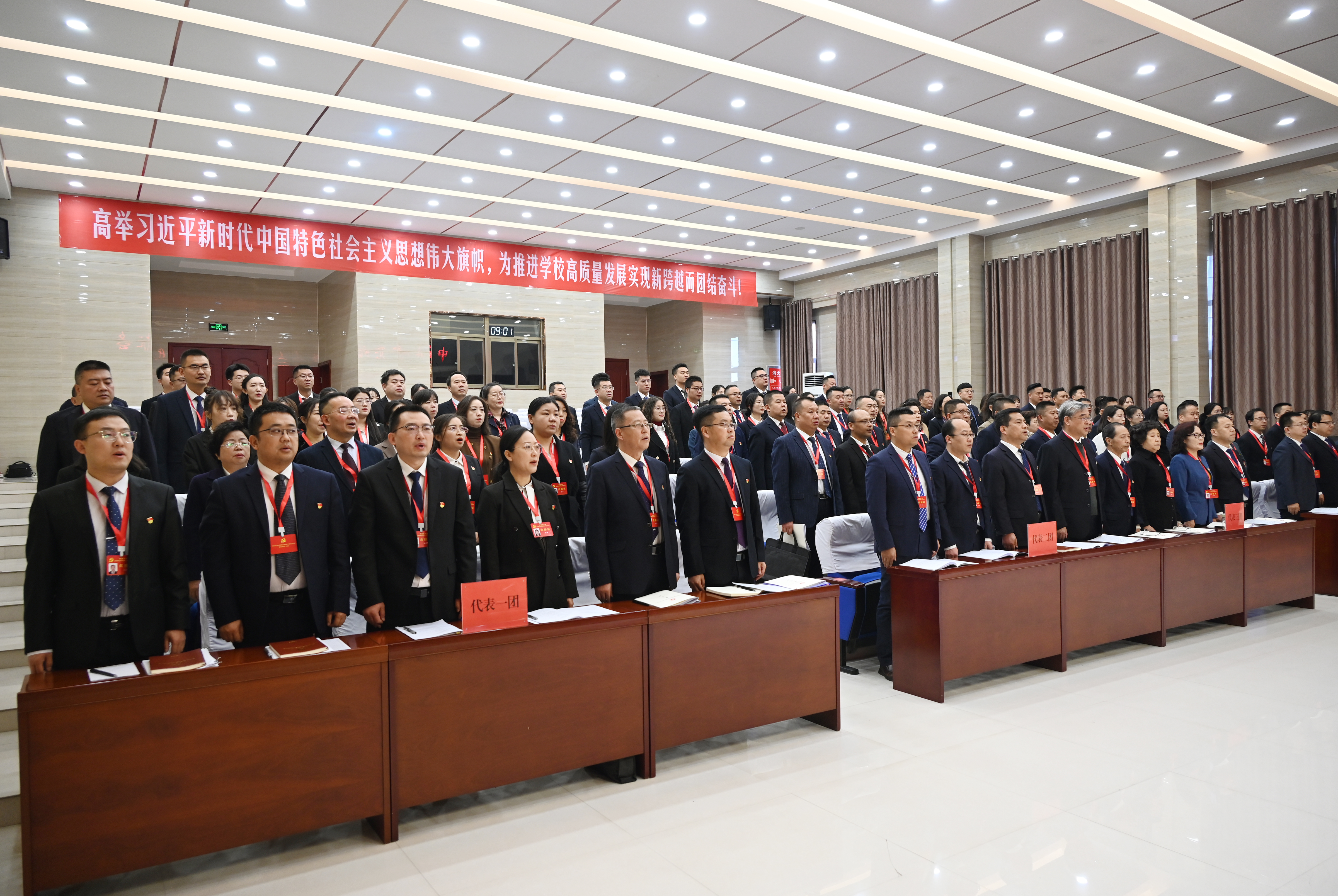 上午9時(shí),大會(huì)在莊嚴(yán)的國(guó)歌聲中拉開(kāi)帷幕。王宏宣布中國(guó)共產(chǎn)黨武威職業(yè)學(xué)院第二次代表大會(huì)正式開(kāi)幕。