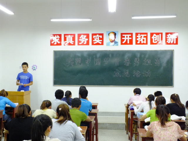 2013年5月20日,藥學(xué)系組織全體班團(tuán)干部在4號教學(xué)樓410教室開展了“實現(xiàn)中國夢,青春勇?lián)?dāng)”的主題班團(tuán)干部會活動,同學(xué)們認(rèn)真聆聽了習(xí)近平在同各界優(yōu)秀青年代表座談時的講話,習(xí)近平強(qiáng)調(diào),青年最富有朝氣,最富有夢想,青年興則國興,青年強(qiáng)則國強(qiáng)。
