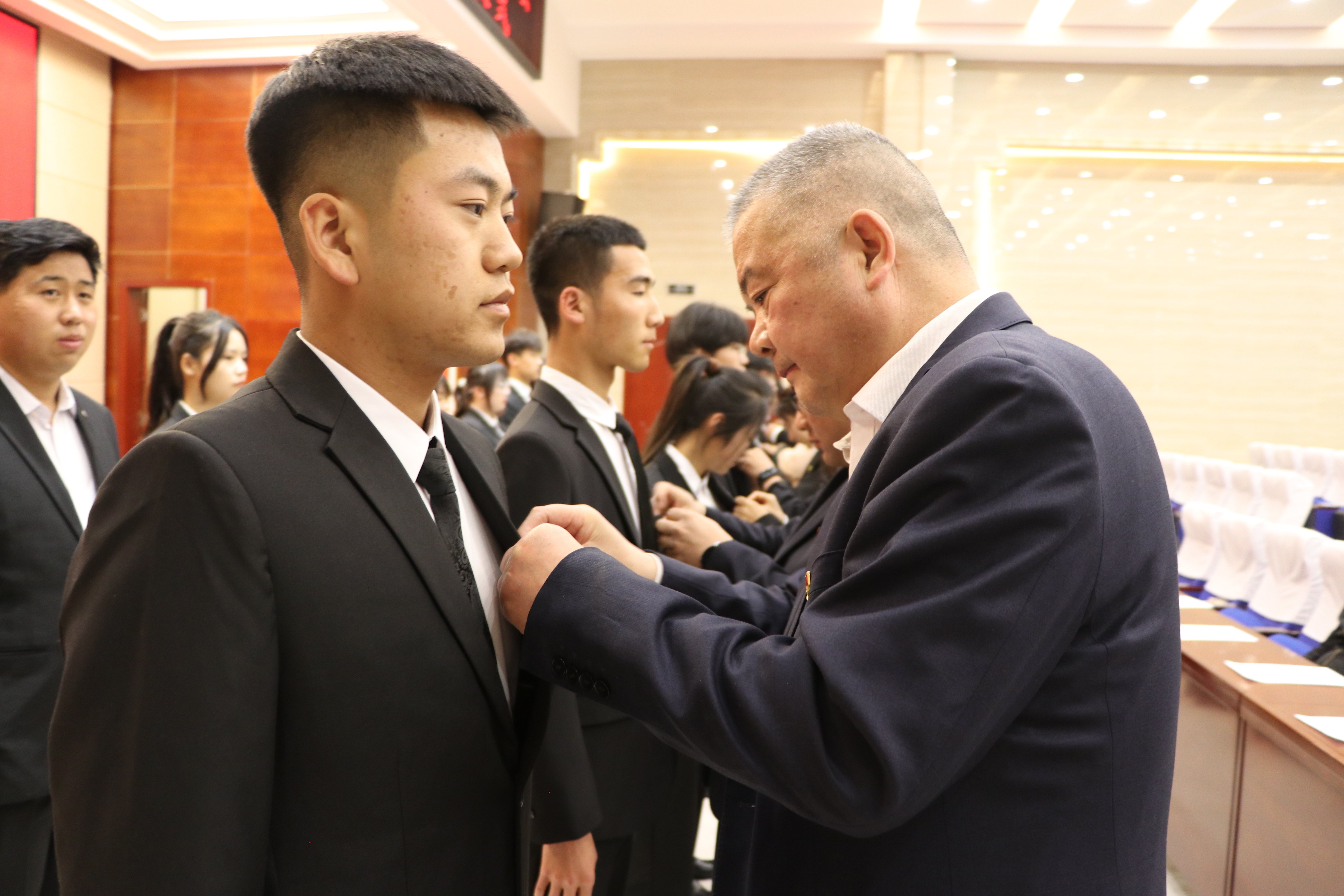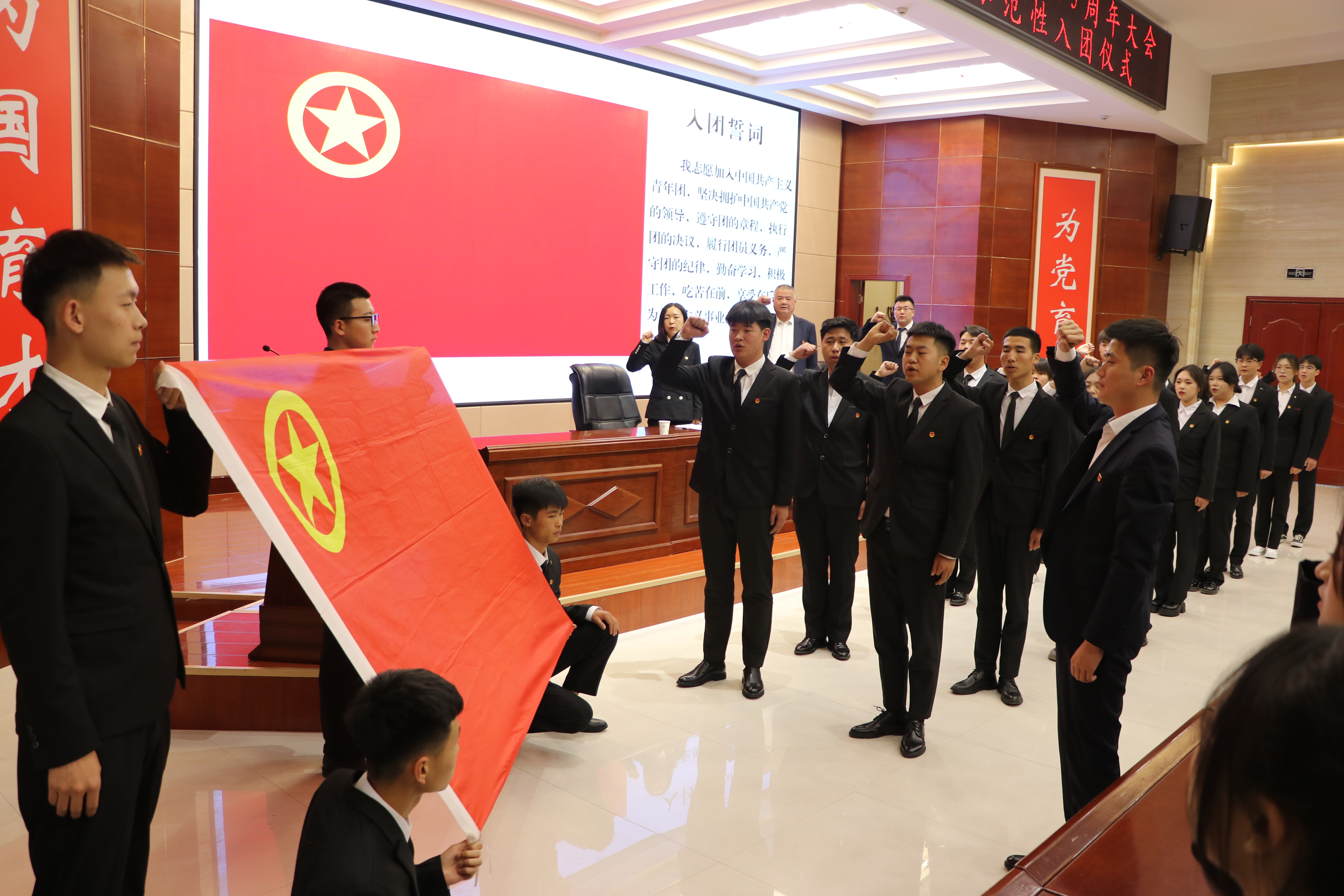 入團儀式上,校團委副書記劉吉仁宣讀235名新團員名單,與會領(lǐng)導(dǎo)、各二級學(xué)院團委書記為新團員代表佩戴團徽舉行頒發(fā)禮,全體新老團員面向團旗莊嚴宣誓。