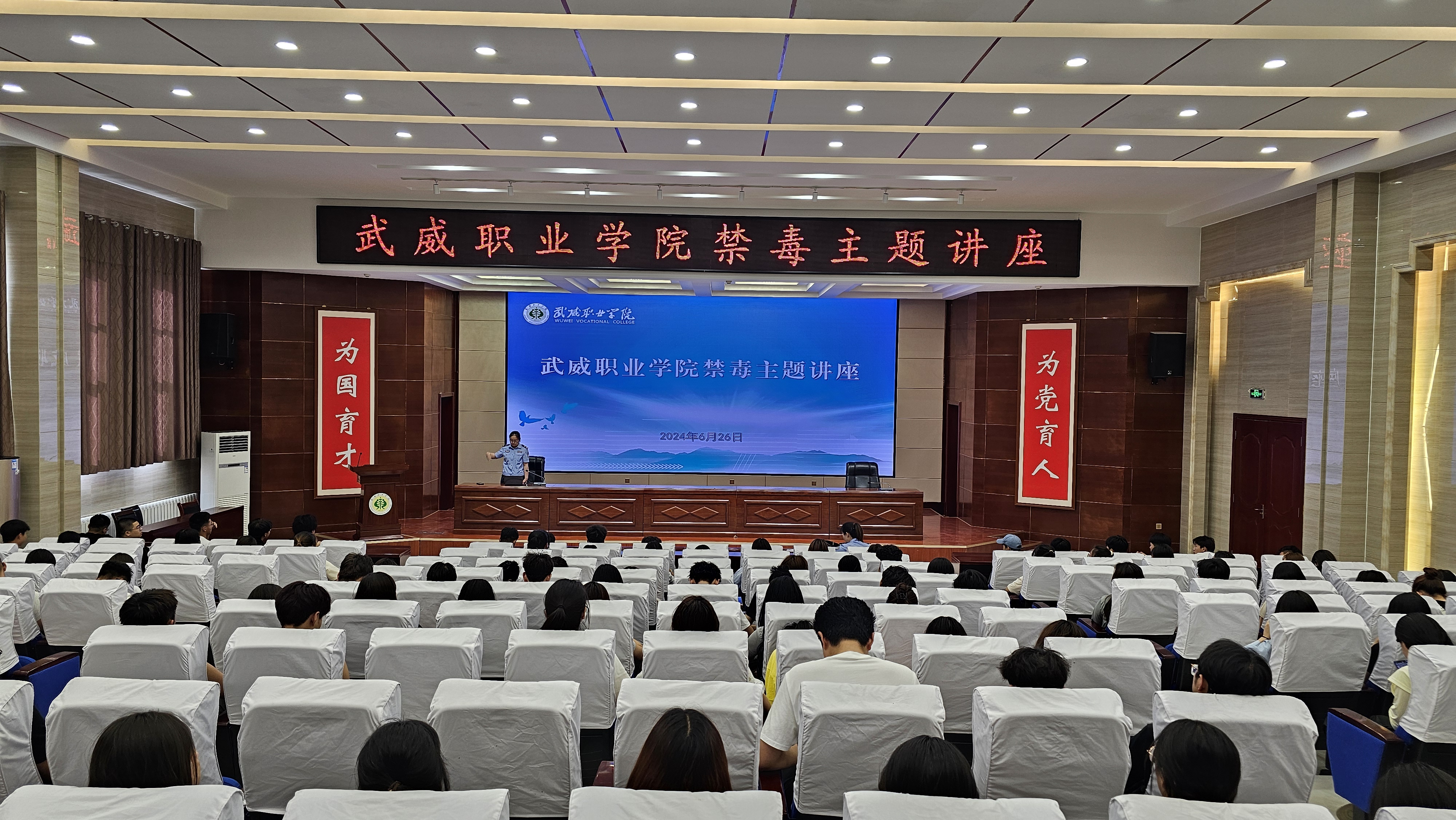 6月26日下午,學校邀請涼州區(qū)公安局西關(guān)派出所阮慧萍警官以《防范藥品濫用,護航無毒青春》為主題作了講座,各二級學院輔導(dǎo)員及學生代表200余人聆聽講座。講座由安全保衛(wèi)處副處長康興奎主持。