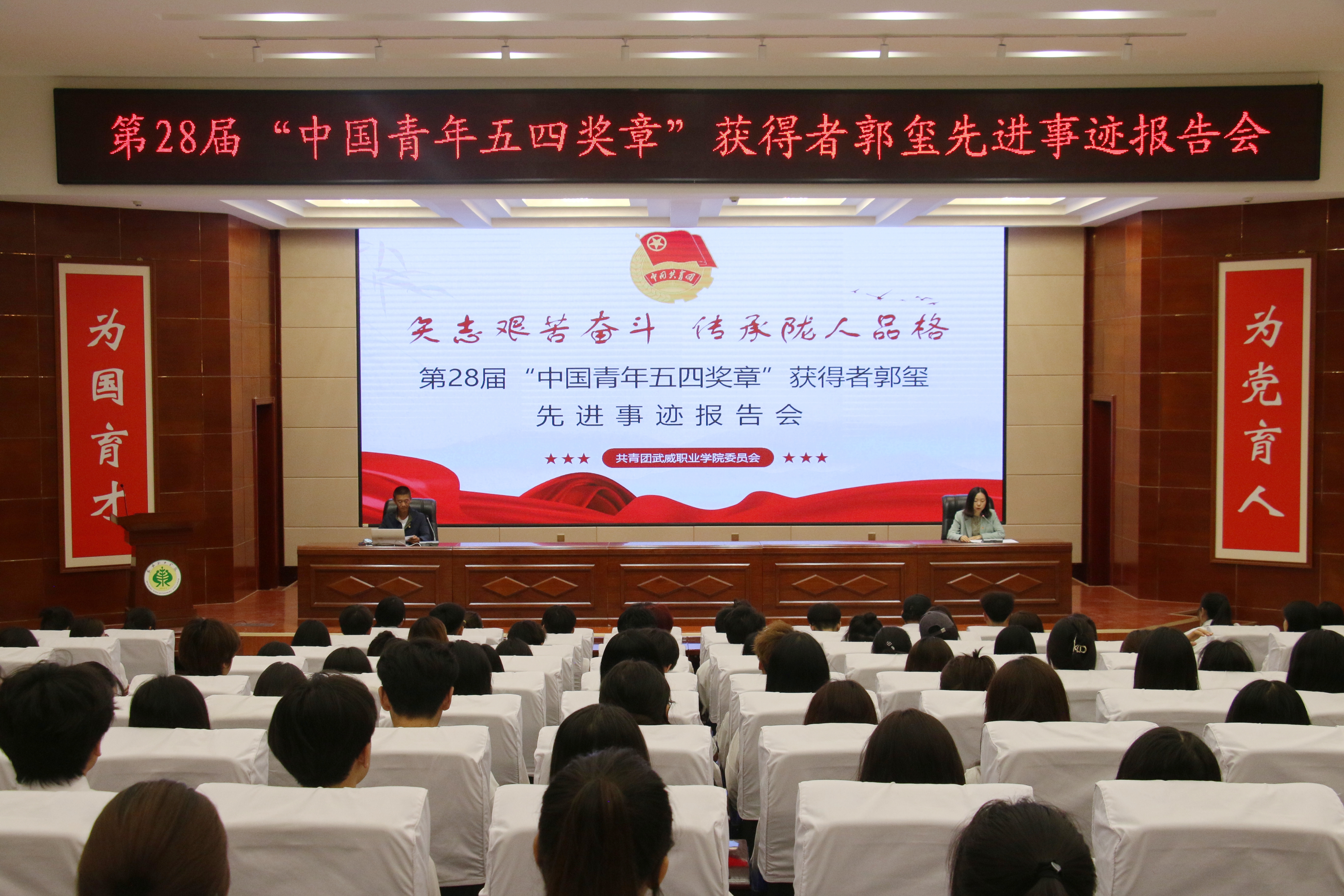 為進(jìn)一步引導(dǎo)和激勵(lì)團(tuán)員青年踔厲奮發(fā)、篤行不怠,厚植奮斗底色,5月24日,學(xué)校在菁英廳舉行“矢志艱苦奮斗傳承隴人品格”第28屆“中國青年五四獎(jiǎng)?wù)隆眰€(gè)人先進(jìn)事跡報(bào)告會(huì)。學(xué)校邀請第28屆“中國青年五四獎(jiǎng)?wù)隆鲍@得者——郭璽同志出席活動(dòng),并作了“三代青春鑄綠洲”主題宣講報(bào)告。學(xué)?!扒囫R工程”培訓(xùn)班學(xué)員、優(yōu)秀學(xué)生代表共計(jì)220余人參加報(bào)告會(huì)。會(huì)議由團(tuán)委副書記謝麗霞主持。