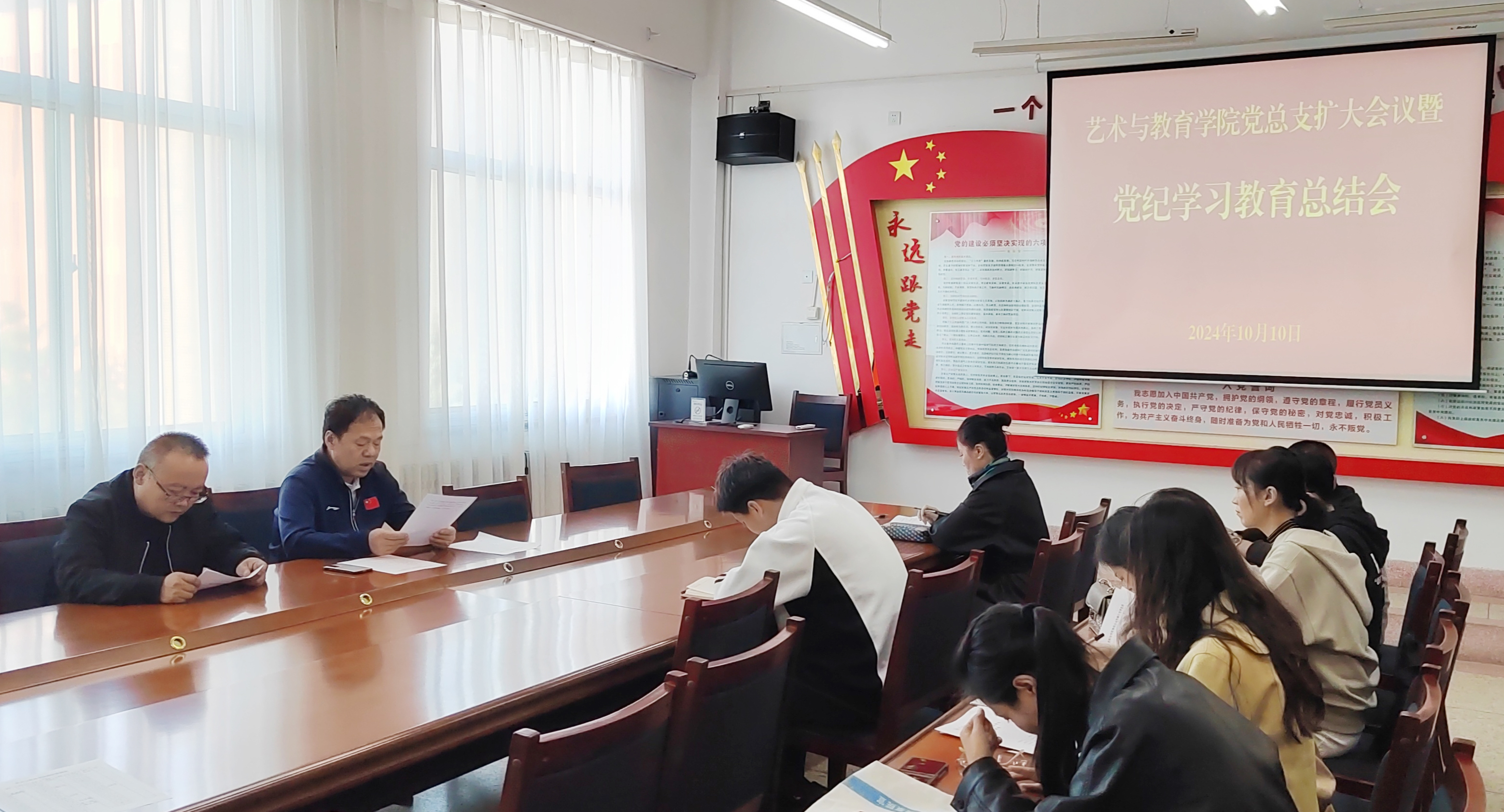 10月10日下午,學(xué)院黨總支擴(kuò)大會(huì)議在勵(lì)勤樓209會(huì)議室舉行,會(huì)議學(xué)習(xí)傳達(dá)了習(xí)近平總書(shū)記在甘肅考察時(shí)的關(guān)于黨紀(jì)學(xué)習(xí)教育的重要講話和指示精神,黨的二十屆三中全會(huì)審議通過(guò)的《中共中央關(guān)于進(jìn)一步全面深化改革、推進(jìn)中國(guó)式現(xiàn)代化的決定》中關(guān)于黨紀(jì)學(xué)習(xí)教育的有關(guān)內(nèi)容和中央、省委、市委、學(xué)校黨委黨紀(jì)學(xué)習(xí)教育總結(jié)大會(huì)精神,總結(jié)了藝術(shù)與教育學(xué)院黨總支黨紀(jì)學(xué)習(xí)教育開(kāi)展情況。會(huì)議由黨總支書(shū)記王政主持,學(xué)院各黨支部委員參加,全體行政人員列席。