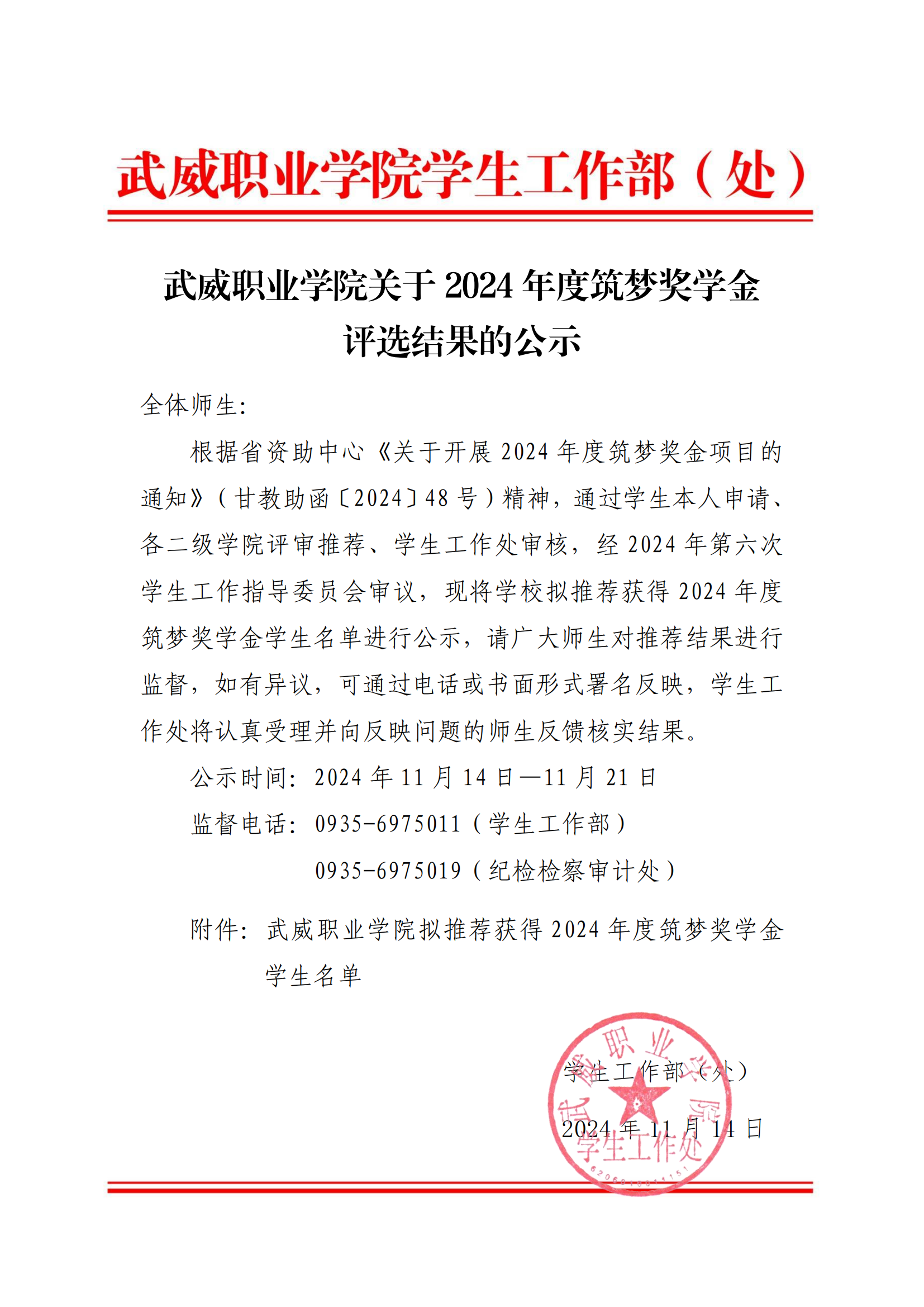 武威職業(yè)學院關(guān)于2024年度筑夢獎學金評選結(jié)果的公示
