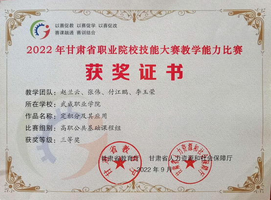 趙蘭云、張偉、 付江鵬、李玉榮 | 定積分及其應(yīng)用 | 省級 | 三等 |