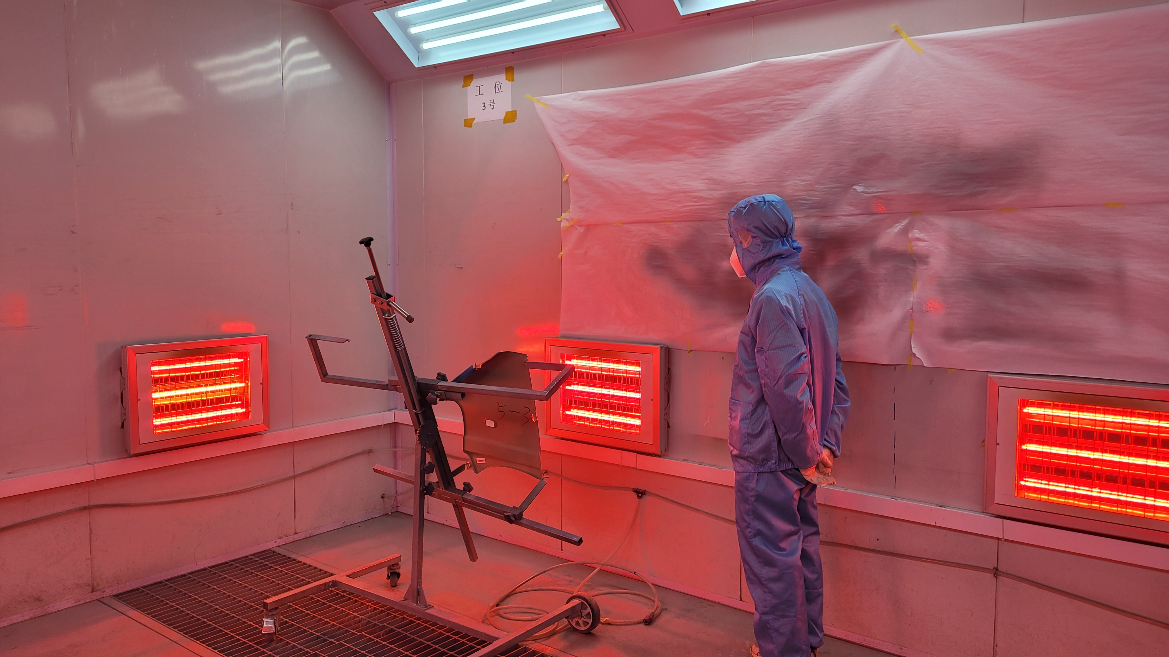 此實訓(xùn)室是兼鈑金、噴涂于一體的實訓(xùn)室,內(nèi)配有噴漆房、噴漆機、噴漆槍、普通和高性能噴漆、烘干箱、鈑金工作臺等,學生可以在真實且安全的壞境下練習和應(yīng)用鈑噴技術(shù),包括車身修補、涂裝物表面處理、烘干和噴漆圖層的評估等,是實訓(xùn)中心必要的設(shè)施之一。
