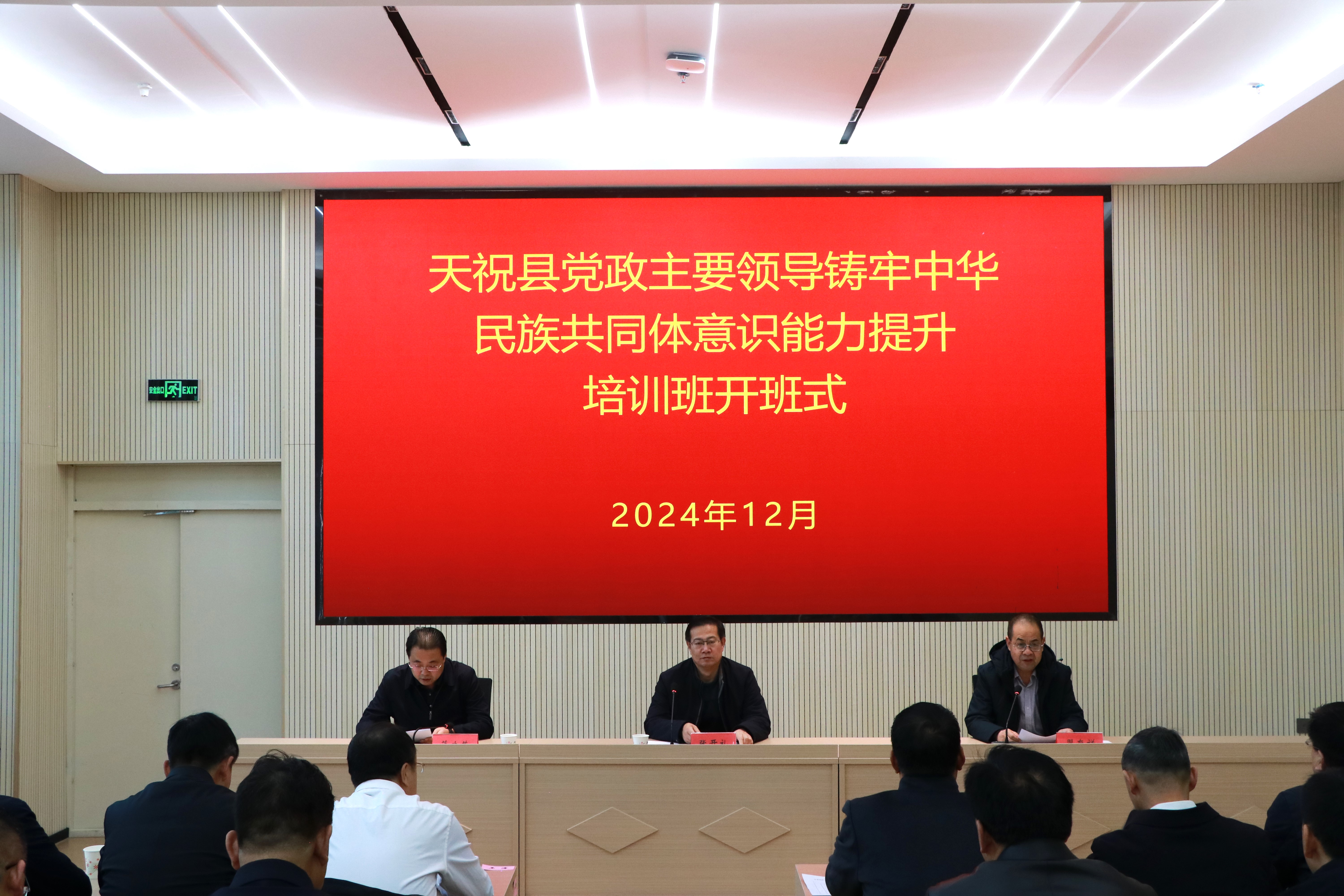 12月3日,由天??h委組織部主辦,我校承辦的“天??h黨政主要領(lǐng)導鑄牢中華民族共同體意識能力提升培訓班”在圖書館二樓報告廳順利開班。天??h委常委、組織部部長蔣生榮,學校校長、黨委副書記張開禮出席開班式。開班式由學校黨委副書記翟存祥主持,天??h縣鄉(xiāng)兩級黨政主要領(lǐng)導90余人參加。