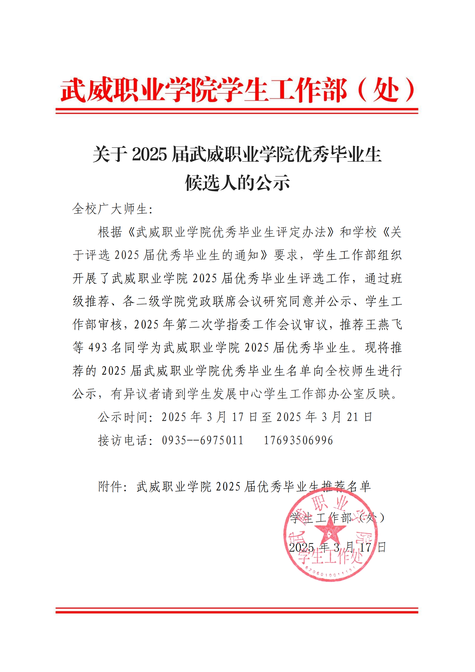 關(guān)于2025屆武威職業(yè)學(xué)院優(yōu)秀畢業(yè)生候選人的公示
